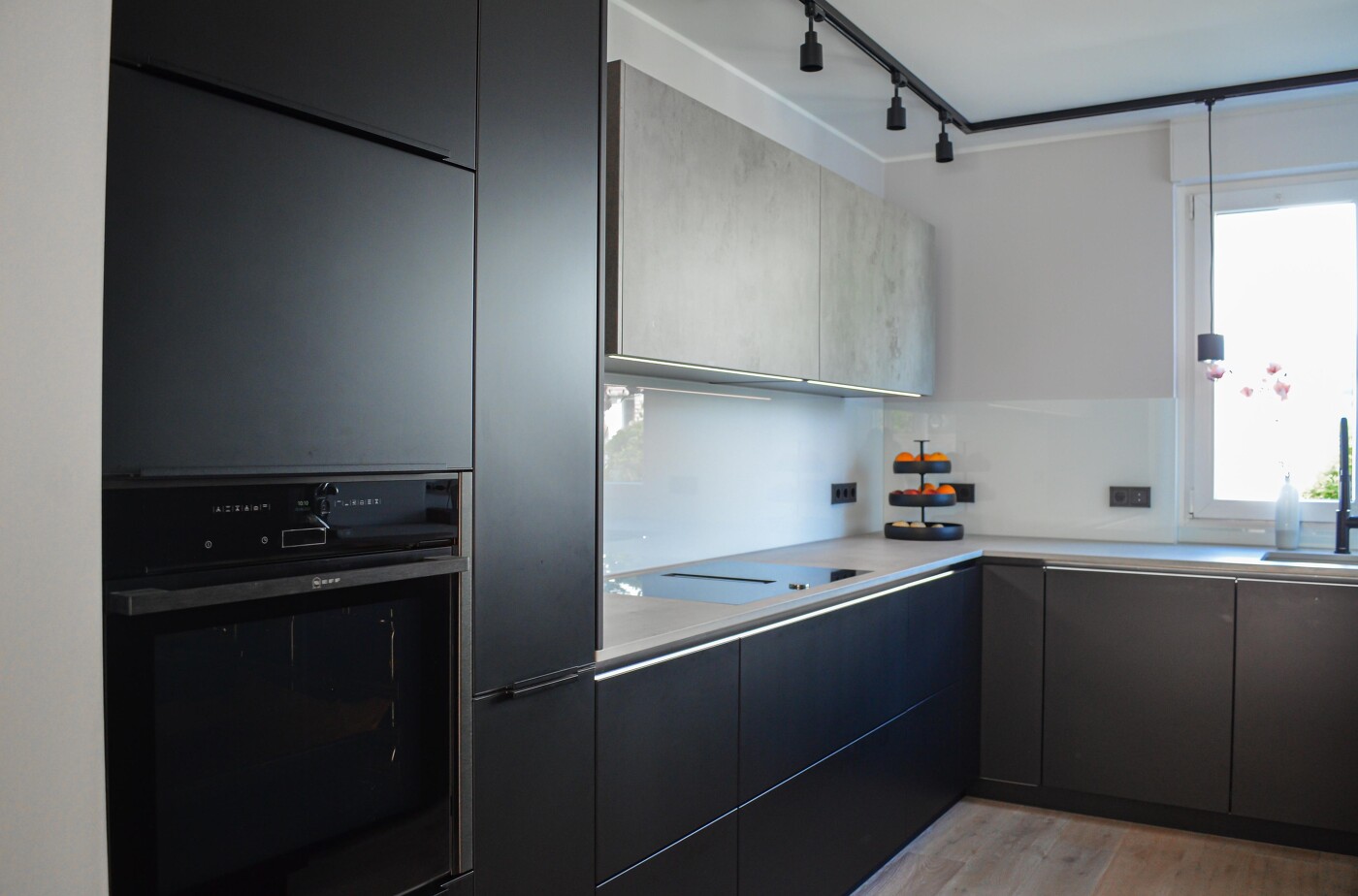 Eine schöne Schwarz Mattlack Küche mit einer Arbeitsplatte und zwei Hängeschränke aus Beton Silk Keramik. Die Hochschränke sind mit Griffen ausgestattet, während der Rest der Küche grifflos ist. Die U-Küche befindet sich in einem abgetrennten Raum, wo Licht vom Fenster und Beleuchtungselemente an der Küche für einen angenehmen Flair sorgen.