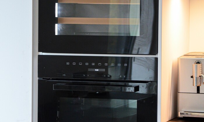This is a creative centre for conversations around food, drinks and enjoyment. A beautiful handleless kitchen with a freestanding kitchen island. Discreet yet fancy: the polar white matt lacquer front and the Iron Corten Satin ceramic worktop are real eye-catchers. The back panel matches the worktop and is set off perfectly by the LED lighting in the wall units. The appliance tall cabinet frames the oven and the wine cooler. An important highlight in this kitchen is the Bora Pure induction hob with an integrated hob extractor.