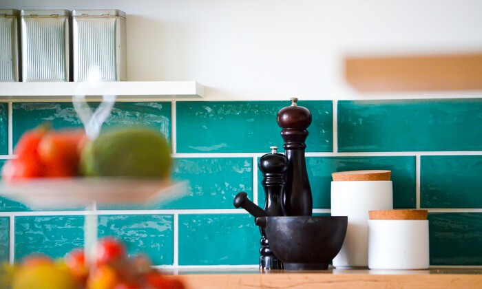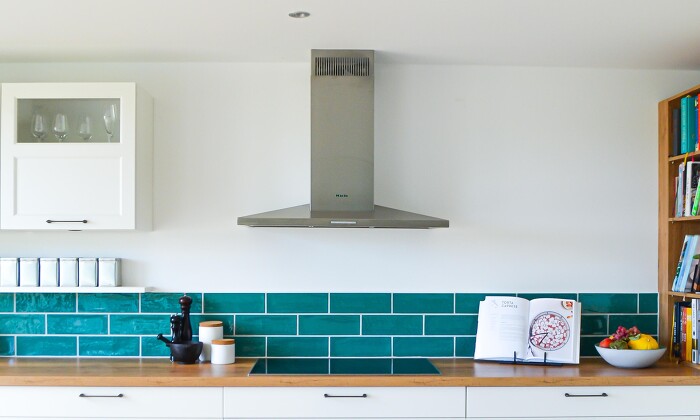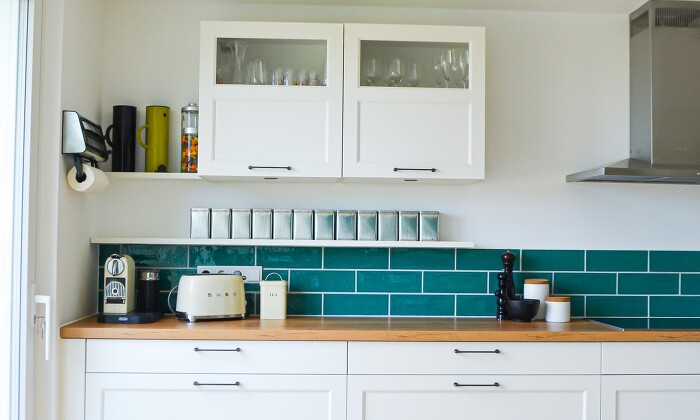 Modern Country - a charming and modern country house kitchen. The white wood fronts and the wooden worktop radiate simplicity and coziness. The splashback made of tiles in aquamarine breaks the typical country house style and creates a lovely atmosphere. The linear design of the Slide & Hide oven from NEFF Home DACH and the integrated warming drawer achieve a minimalist look. This kitchen is definitely the new favorite place of the family and it offers enough place to cook.
