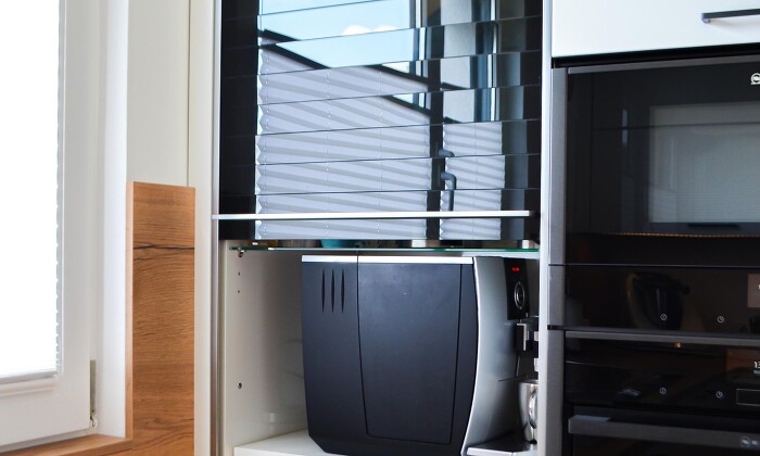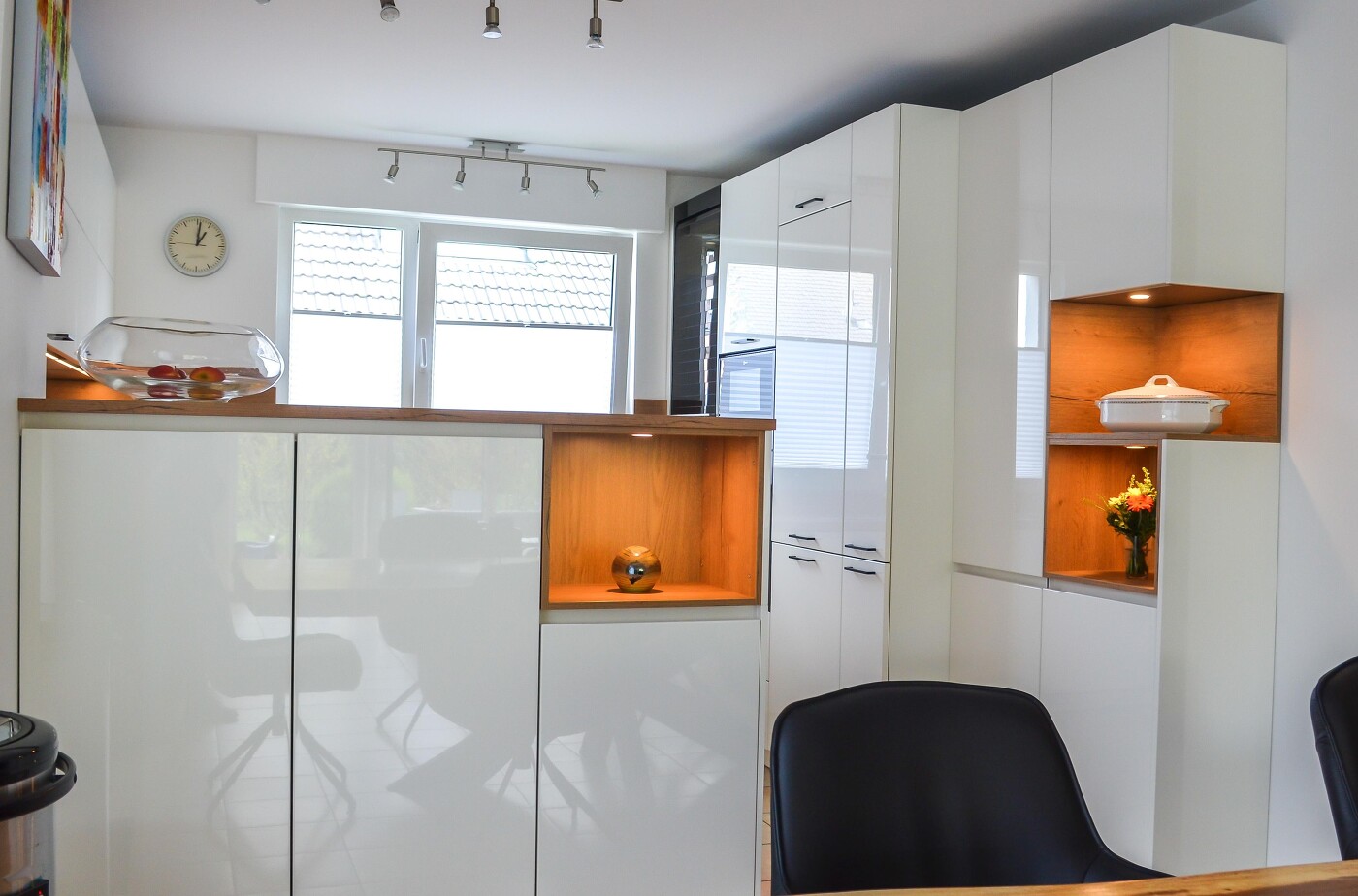 Die weiße Hochglanz Lack Front, in Kombination mit einer Alteiche Natur Arbeitsplatte und einer mattschwarzen Griffleiste, erzeugen eine schlichte Eleganz. In dem Geräte-Hochschrank befindet sich ein NEFF Einbaubackofen und eine NEFF Mikrowelle mit Grill Funktion. Um Platz zu sparen, dient der Tablar-Auszug in dem schwarzen Glas Rollladenschrank als perfekter Stauraum für die Kaffeemaschine.