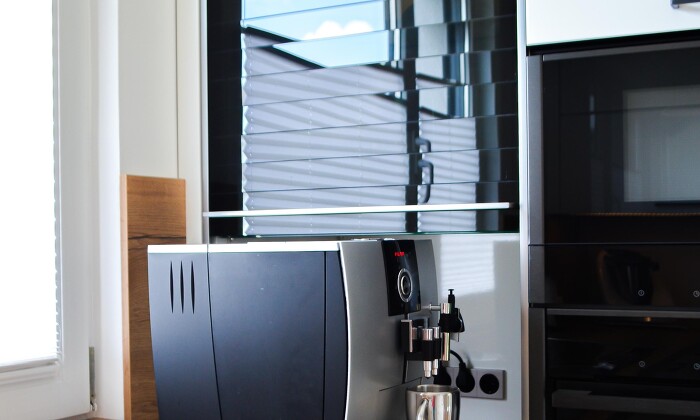 The white high-gloss lacquer front, in combination with a natural old oak worktop and a matt black handle strip, create a simple elegance. The tall unit contains a NEFF built-in oven and a NEFF microwave with grill function. To save space, the pull-out shelf in the black glass cabinet serves as the perfect storage space for the coffee machine.