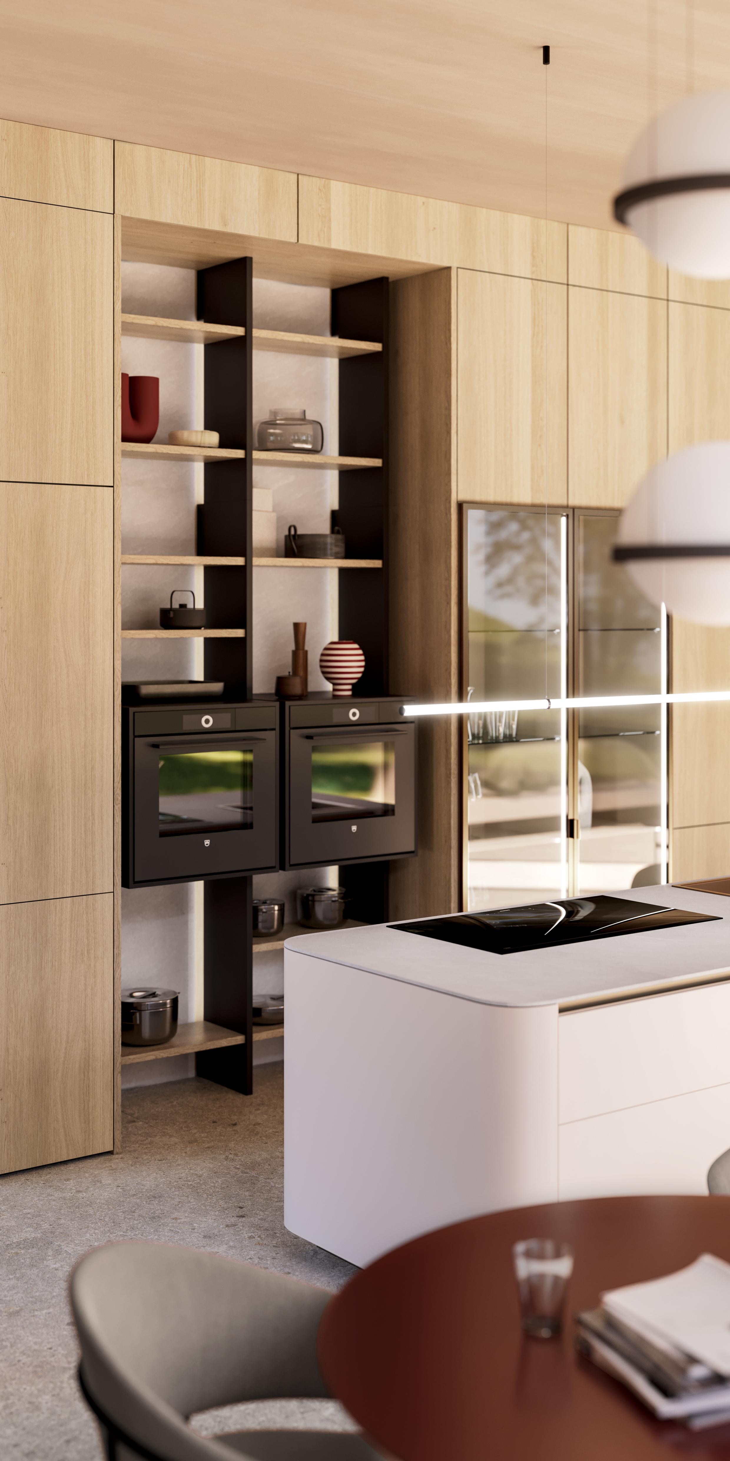Typisch für LEICHT ist die hochwertige Verarbeitung bis ins kleinste Detail: Die Innenseiten der Wangen passen sich den sichtbaren Frontseiten in höchster Präzision an, zugleich unterstreicht eine Arbeitsplatte aus Kompaktmaterial die stilvolle Optik durch natürlich wirkende Einschlüsse und lebendige Strukturen. Großzügige Radien an den Ecken der Platte schließen bündig mit der gebogenen Silhouette ab. Neben Arbeitsplatten tragen auch abgerundete Abdeckböden und Tischplatten zur skulpturalen Wirkung der Möbel bei.