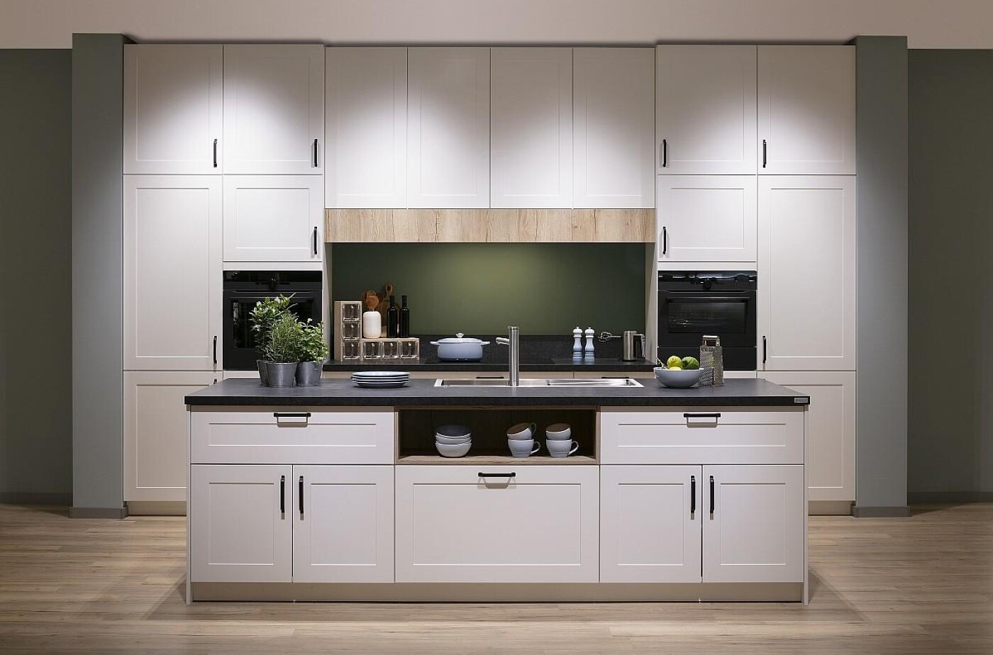 Die Geräteaufteilung folgt dieser harmonischen Komposition gleichfalls wie auch die farbliche Hervorhebung dank weißer Fronten vor den in hellem Taubenblau gestrichenen Wänden. Zum gelungenen Fokus auf diese ausgewogene Geometrie passen natürlich gerade auch Kassettenfronten gut.