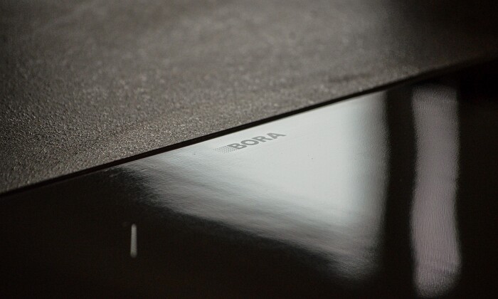 This is a creative centre for conversations around food, drinks and enjoyment. A beautiful handleless kitchen with a freestanding kitchen island. Discreet yet fancy: the polar white matt lacquer front and the Iron Corten Satin ceramic worktop are real eye-catchers. The back panel matches the worktop and is set off perfectly by the LED lighting in the wall units. The appliance tall cabinet frames the oven and the wine cooler. An important highlight in this kitchen is the Bora Pure induction hob with an integrated hob extractor.