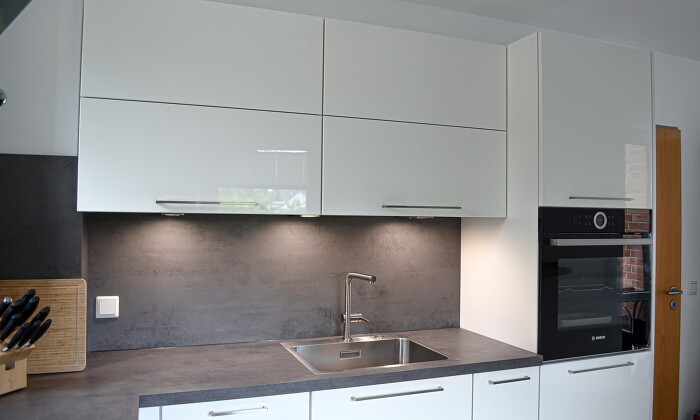 A small cozy kitchen. The concrete slate grey worktop & niche cladding and the stainless-steel handle strip create a beautiful contrast to the white high-gloss front. The shelf element is great for storing cookbooks and the shelf lights create a pleasant atmosphere at night.