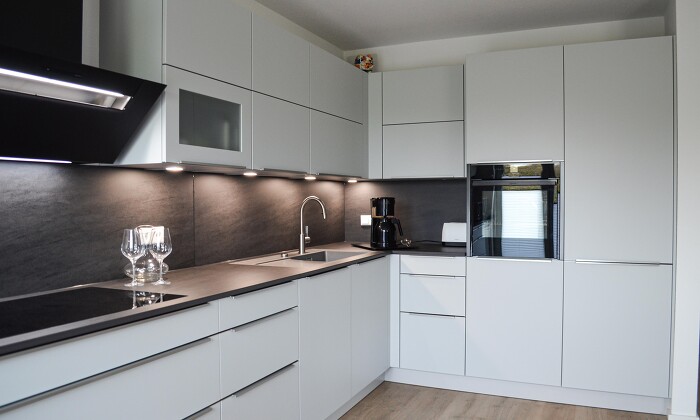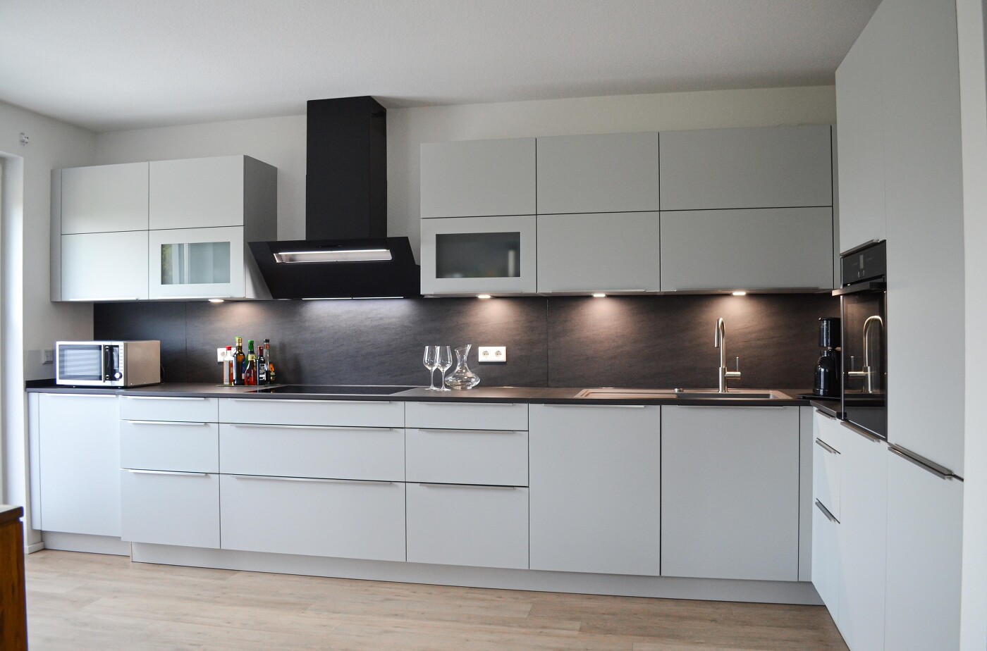 Eine Lichtgraue Küchenschönheit! Ruhige Eleganz geht Hand in Hand mit einer Basalt Black Satin Arbeitsplatte und Nischenrückwand. Auch in dieser Küche verschafft die Beleuchtung eine wohnliche Atmosphäre.