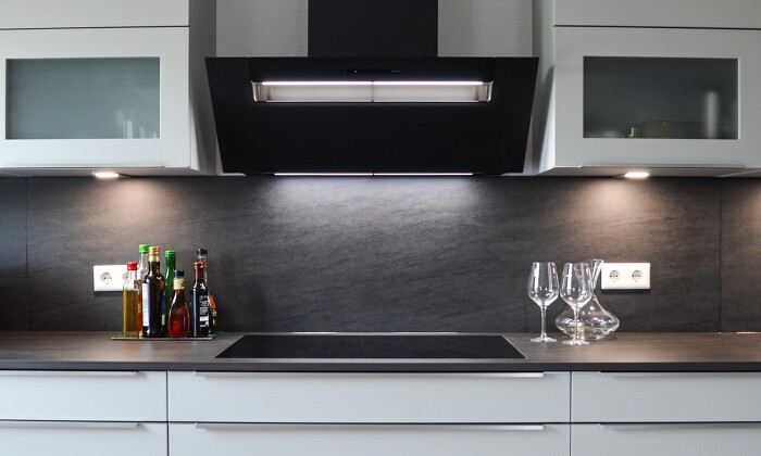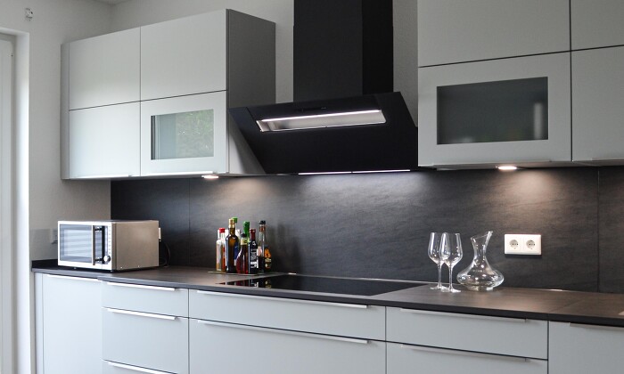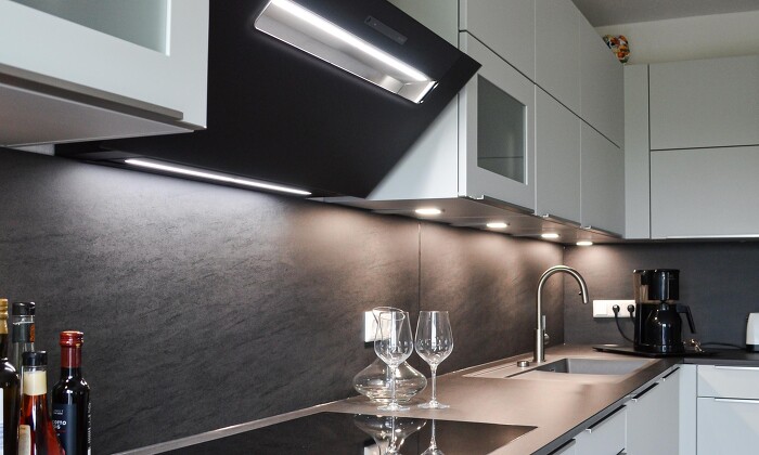 A light grey kitchen beauty! Calm elegance goes hand in hand with a Basalt Black Satin worktop and niche splashback. Under-cabinet lighting also creates a homely atmosphere in this kitchen.