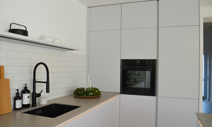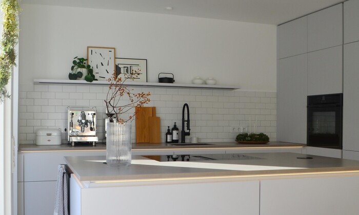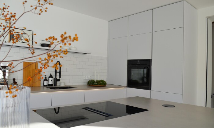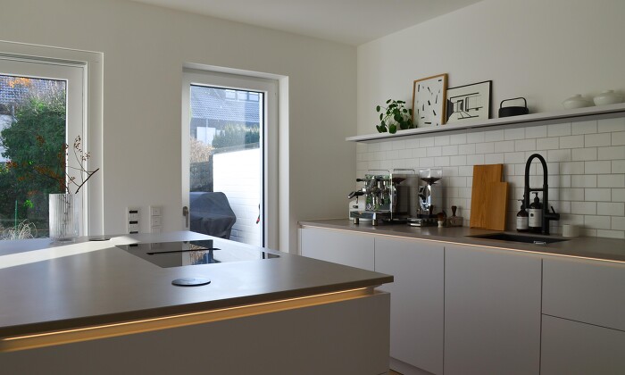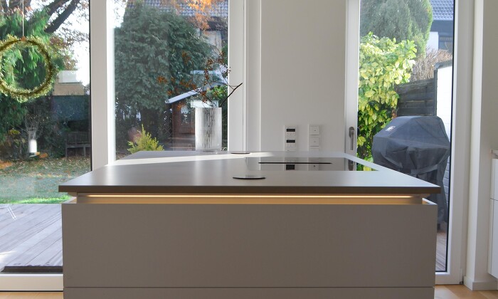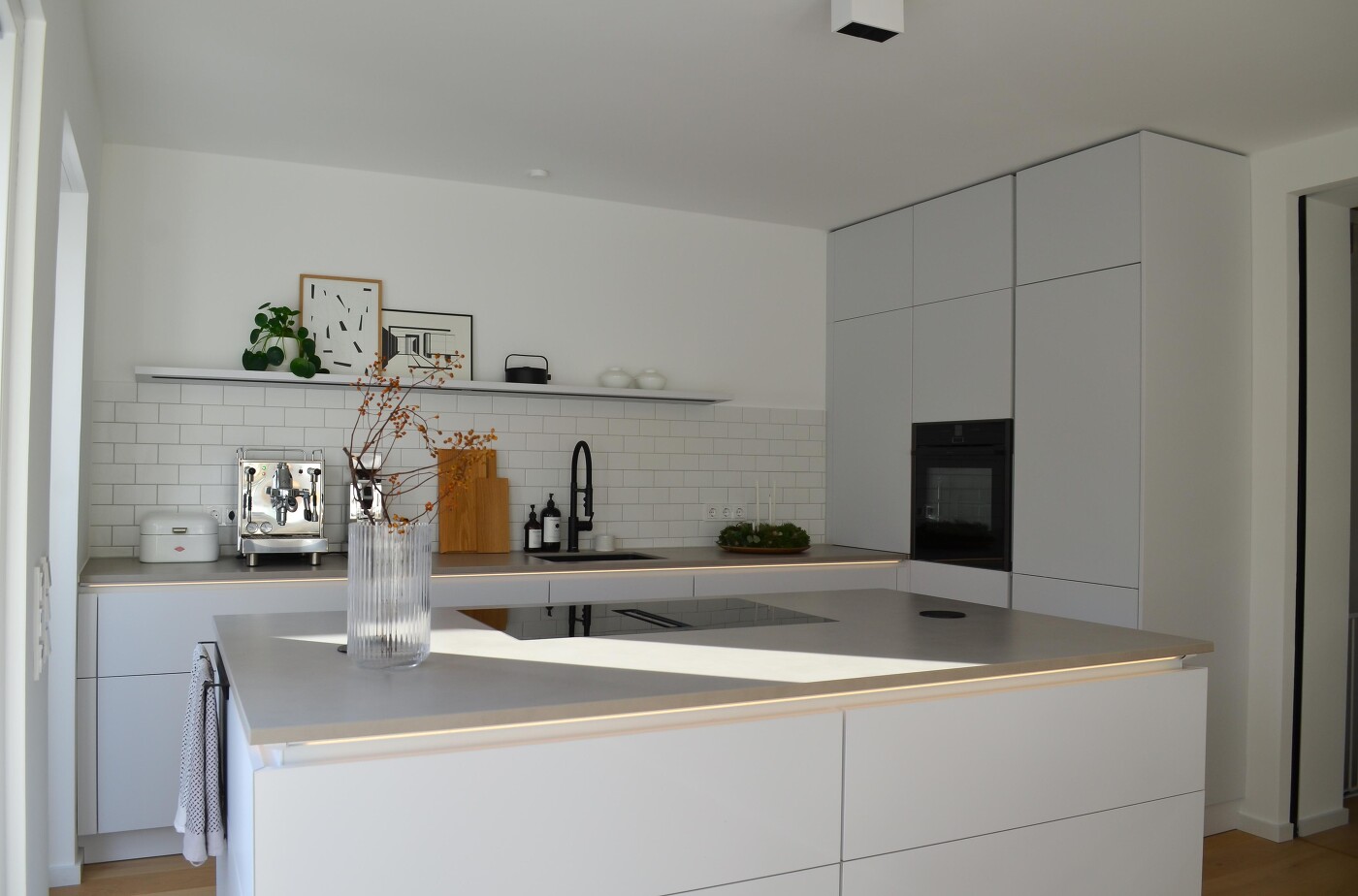 In dieser Küche ist Schlichtheit gewünscht, statt starke Kontraste. Die Arbeitsplatte Pierte di Luna Silk harmoniert mit der Merino Küchenfront und erzielt somit ein minimalistisches Design. Die vielen & großen Fenster geben dem Raum Klarheit für eine schöne Atmosphäre und für Quality-Time mit der Familie.