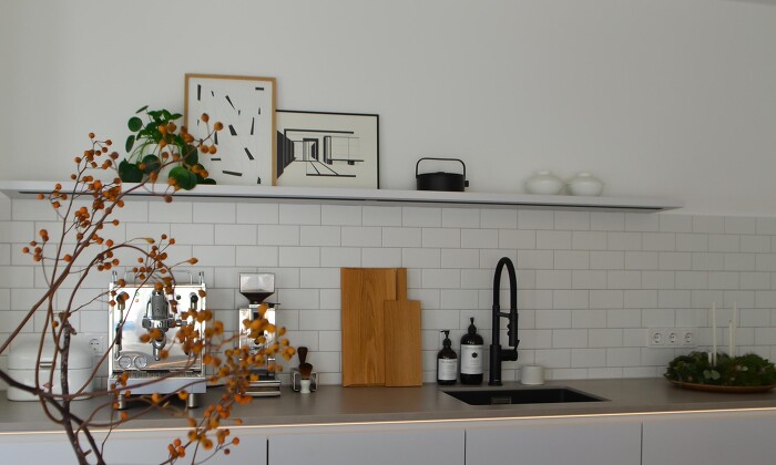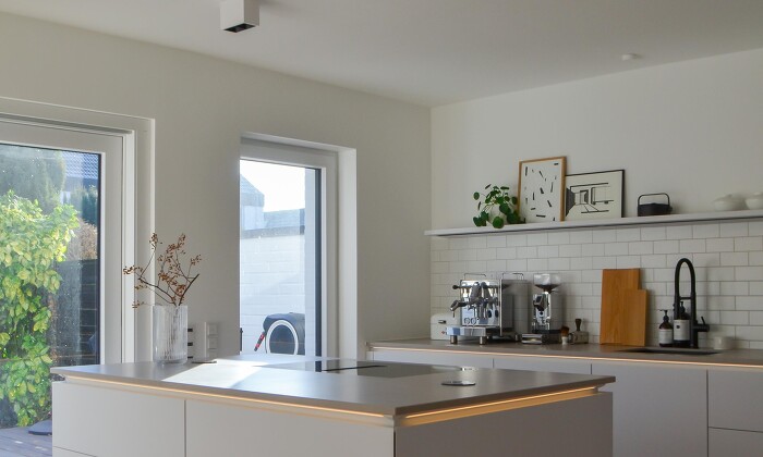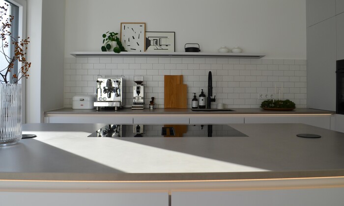 In this kitchen, simplicity is desired instead of strong contrasts. The Pierte di Luna Silk worktop harmonizes with the Merino kitchen front, creating a minimalist design. The many & large windows give the room clarity for a beautiful atmosphere and quality time with the family.