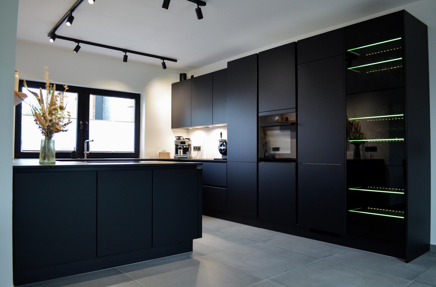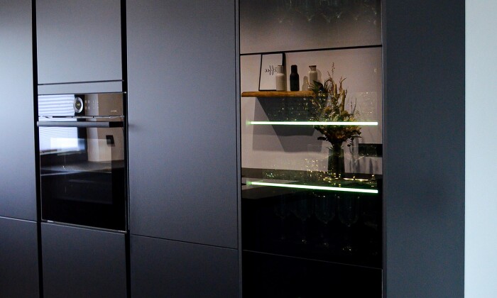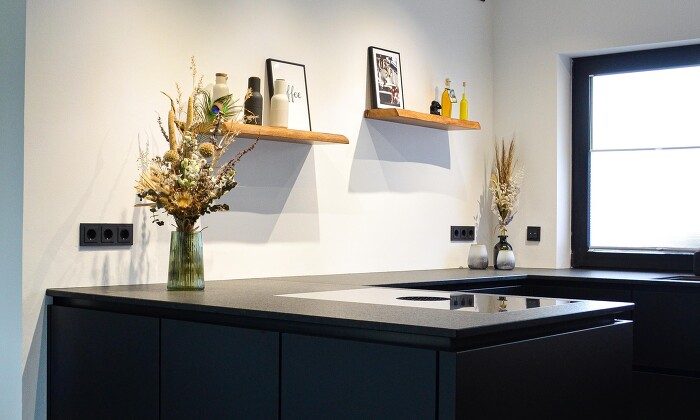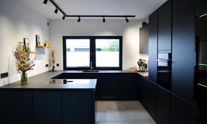 Weiße Küchen waren schon immer beliebt - aber jetzt klettern auch die schwarzen Küchen auf der Trendleiter immer weiter nach oben, denn diese bieten einen eleganten und zugleich stimmungsvollen Look. Unsere Kunden haben sich für eine grifflose Küche mit mattschwarzen Fronten entschieden. Trotz Raffinesse wird durch eine natürliche Dekoration ein warmes und vertrautes Gefühl vermittelt. Die Vitrine mit Beleuchtung ist ein echter Eyecatcher und ein perfekter Ort, um edles Geschirr oder Gläser auszustellen.