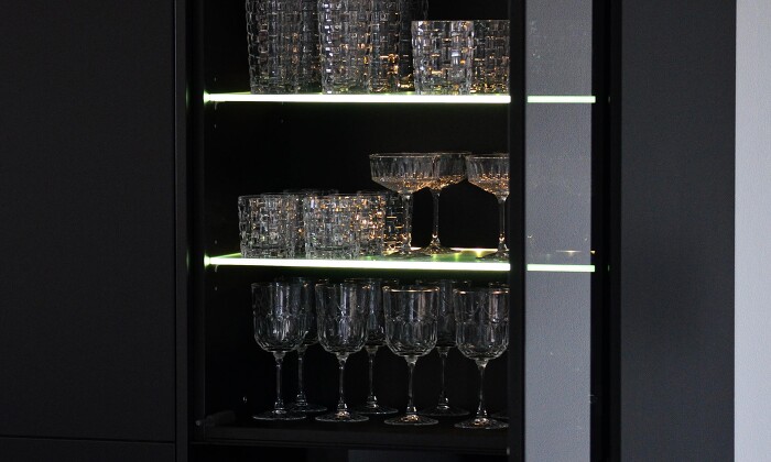 White kitchens have always been popular - but now black kitchens are also becoming very trendy, offering a look that is both elegant and atmospheric. Our customers decided on a handleless kitchen with black cabinet facades. Despite sophistication, a natural decoration provides a warm and welcoming feeling. The glass cabinet with lighting is a real eye-catcher and a perfect place to display fine dishes or glasses.