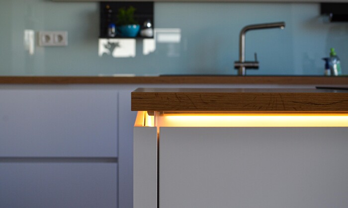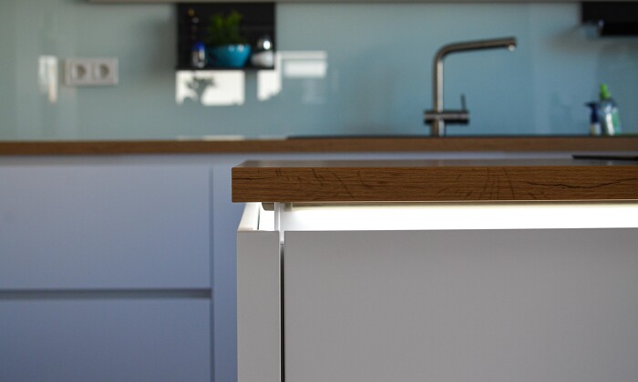 Just wow! It makes us proud to see how happy our customers are with their new dream kitchen. Every single kitchen is unique and individually designed. In this kitchen, the different heights of the worktop and the cooking island are very striking. To ensure that both partners can cook in their kitchen in a suitable space, both work areas have been designed to fit the size of the respective persons. Beautiful highlights are the lighting elements on the back wall of the niche and the cooking island, which creates a pleasant atmosphere.
