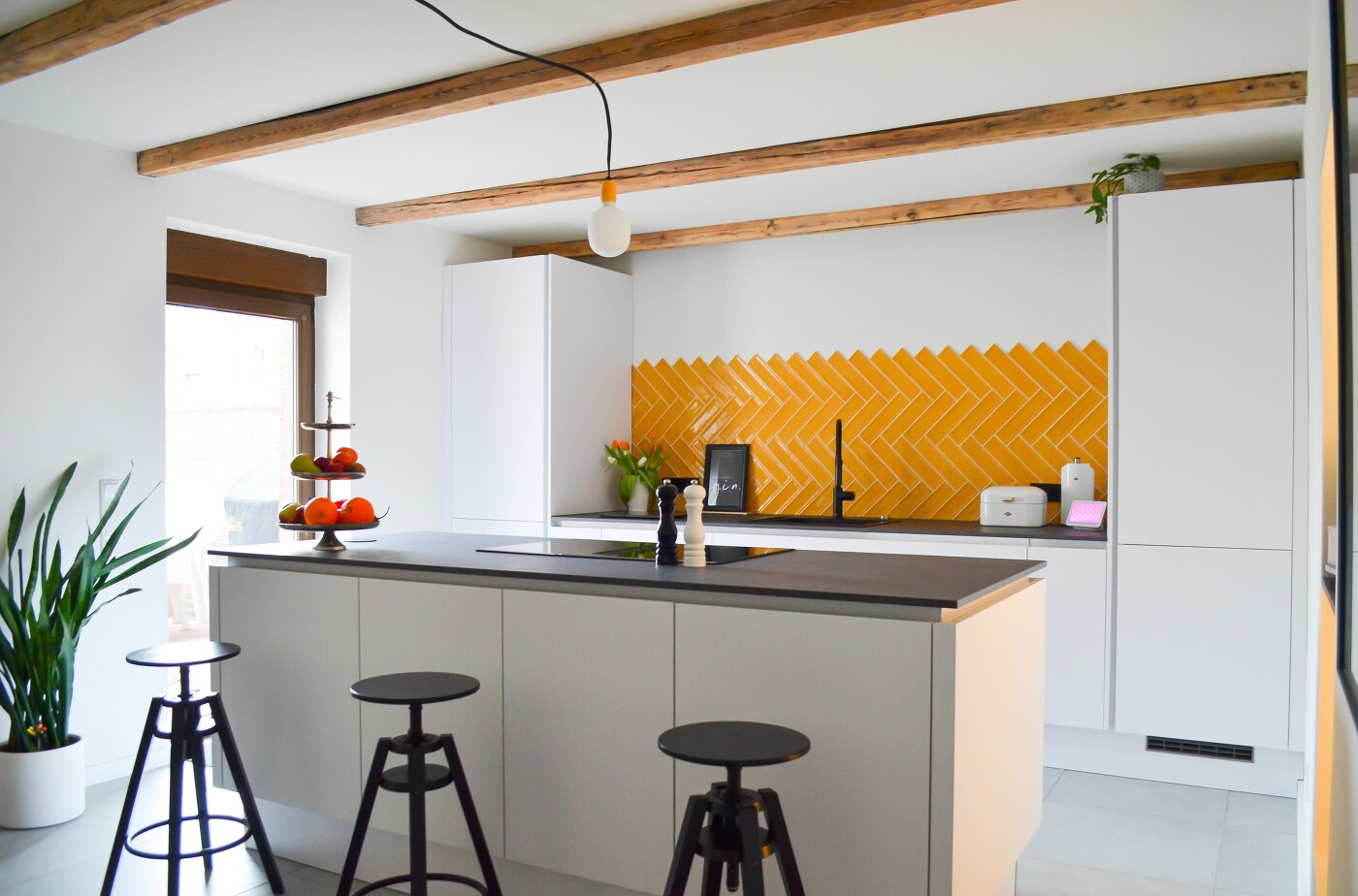 Wir waren wieder bei unseren Kunden zu Besuch, um deren Küche zu fotografieren. Diese Küche ist definitiv einladend und sorgt durch die farbige Fliesenrückwand für eine sommerliche Atmosphäre. Unsere Kunden haben uns mitgeteilt, dass bereits der erste Termin sie davon überzeugt hat, dass sie die richtige Entscheidung getroffen haben bei uns ihre Traumkühe zu suchen. Und nun steht sie da, deren gefundene Traumküche aus einer polarweißen ultramattlack Front und einer spachtelbeton Graphit Arbeitsplatte.