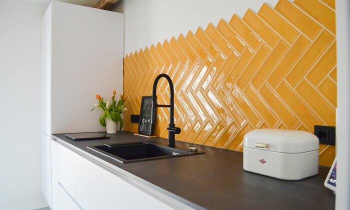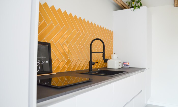 We visited our customers again to photograph their kitchen. This kitchen is definitely inviting and creates a summerlike atmosphere due to the colored tile backsplash. Our customers mentioned that their first appointment convinced them that they had made the right decision to search for their dream kitchen with us at our kitchen studio. And now there it is, their dream kitchen made of a polar white ultramatt lacquer front and a spatula concrete graphite worktop.
