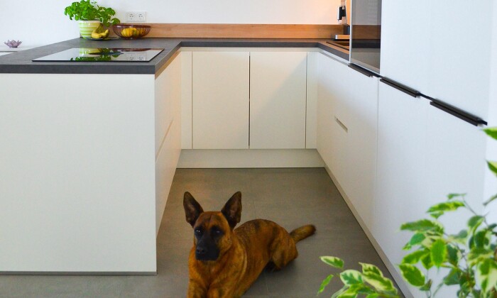 Na, wen haben wir denn da? Bei einer unserer letzten Kundenbesuche wollte der Hund unserer Kundin Model sein. Wir gehen mal fest davon aus, dass dieses Mal der Hund die Küche toll in Szene gesetzt hat! Oder was meint Ihr? Eine mattweiße Küche mit einer Spachtelbeton Graphit Arbeitsplatte und Regalelemente und Nischenverkleidung in Sommereiche - eine wirklich schöne und schlichte Farb- & Materialkombination.