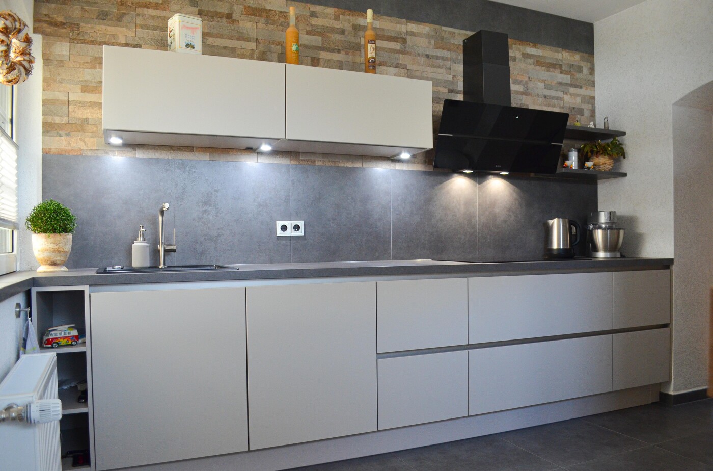Eine wohnliche Küchenzeile, die Gemütlichkeit ausstrahlt. Die grifflosen Fronten in Sand ultramatt und die Arbeitsplatte in Beton Schiefergrau gehen fließend ineinander über. Zwei Aspekte in dieser Küche sind auf der gegenüberliegenden Seite der Wandschrank und im anderen Raum ein Hochschrank. Der Wandschrank, inklusive Backofen und Kühlschrank, lässt sich mit einem Push-to-Open Mechanismus elektrisch öffnen. Der Hochschrank im anderen Raum versteckt unauffällig den großen Heizungskörper. Da unsere Kunden in der Küche gerne viel Zeit verbringen und dort essen, haben wir eine Theke aus eine Eiche Sierra Nachbildung mit eingeplant und montiert.