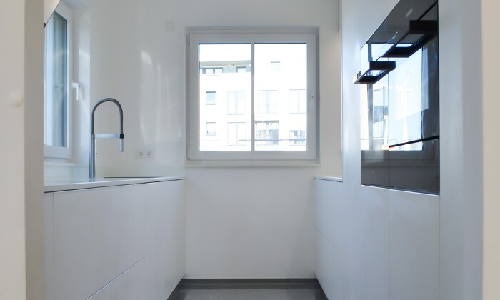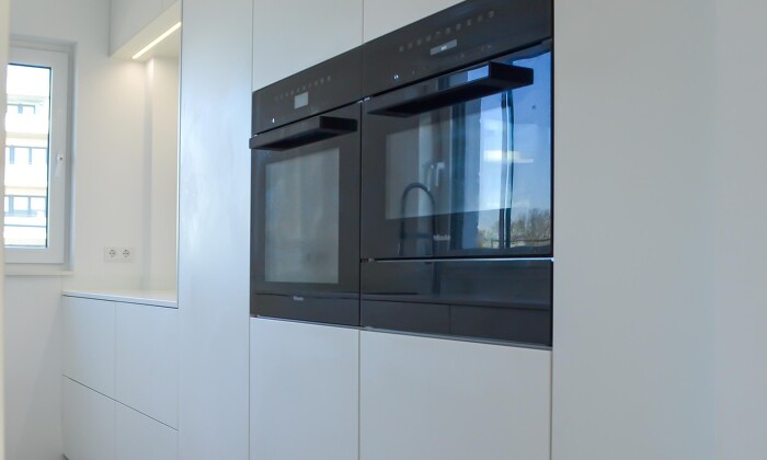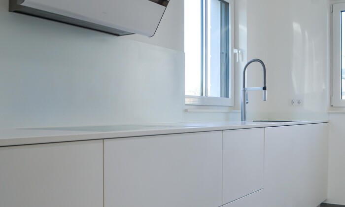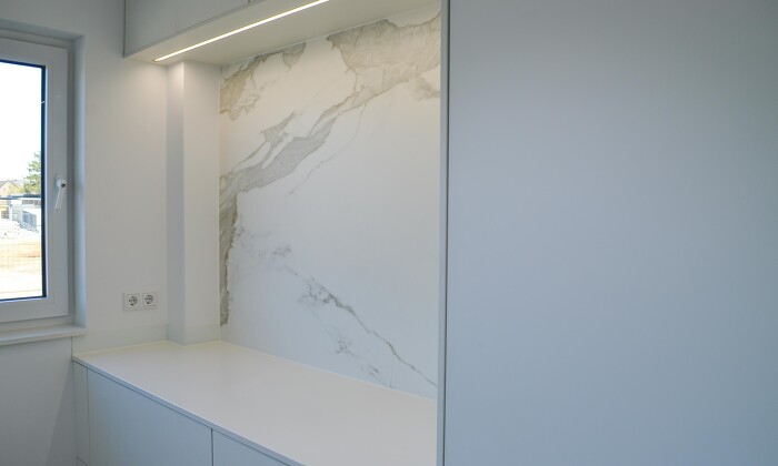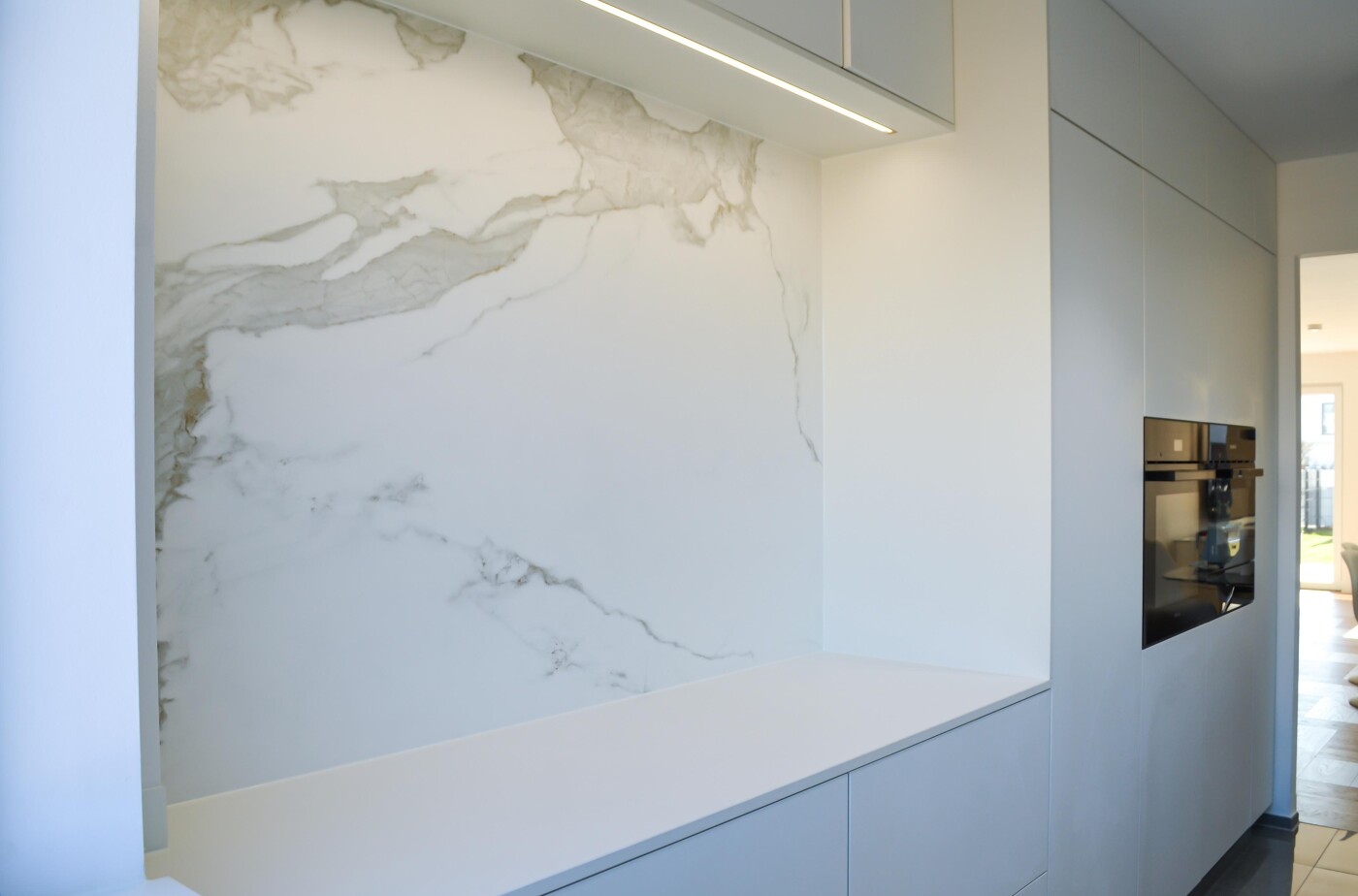 Very minimalist and visually simple – For our customer, a narrow room was to be filled with a kitchen. As the room is quite small, light colours were required, so it wouldn’t look even smaller. Our customer opted for an all-white kitchen: a white special matt lacquer front, an Artic White Silk worktop, a white glass back panel and an Estatuario Silk ceramic back panel. An eye-catcher is definitely the large back panel, which is beautifully outlined by the base unit lighting.