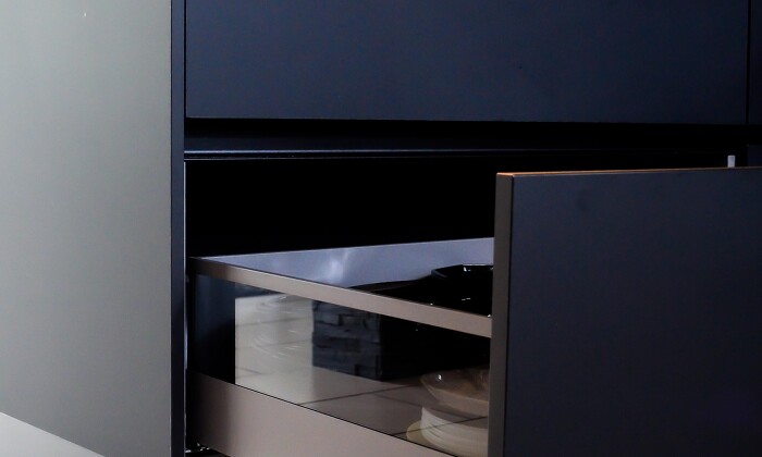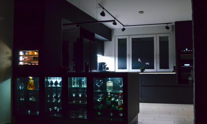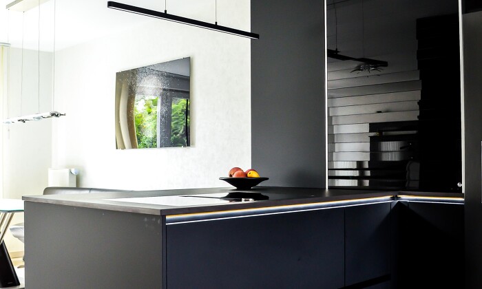 Entdecken Sie völlig neue Möglichkeiten für Ihre persönliche Traumküche. Genau nach dem Geschmack unserer Kunden, genauso haben wir deren Küche geplant – einzigartig, stilvoll und aufregend. Schwarze Mattlack Fronten und eine Keramik Arbeitsplatte in perfekter Harmonie. Die Glasvitrinen mit steuerbaren LED-Licht und der Weinkühlschrank sind ein toller Hingucker und erschaffen eine gemütliche Atmosphäre bei Nacht. Die Hängeschränke mit integrierter Beleuchtung stellen Geschirr schön in Szene und das Glas Auszugssystem (Slim Line Drawer) ermöglicht mehr Sichtbarkeit. Zwei weitere Highlights sind die Nischenrückwand aus Glas in der Farbe Bronze glänzend und die Glas-Rollladen mit elektrischer Öffnung und Schließung.