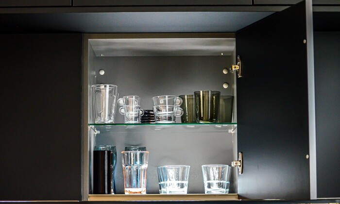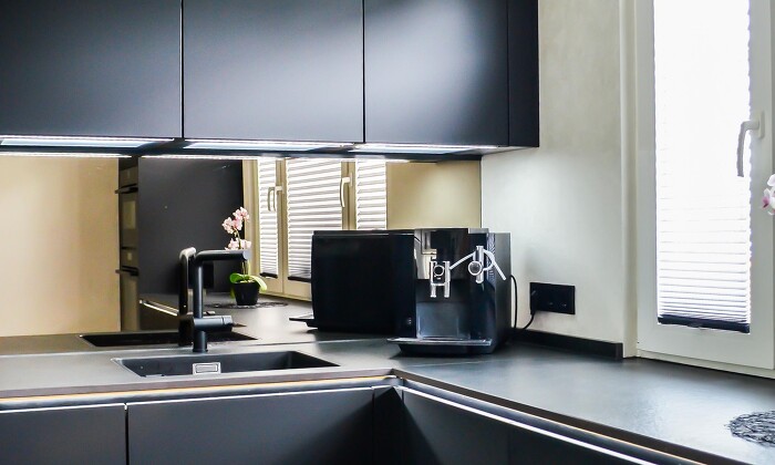 Discover completely new possibilities for your personal dream kitchen. We planned this kitchen exactly to the preferences of our customers - unique, stylish and exciting. Black matt lacquer fronts and a ceramic worktop are in perfect harmony. The glass cabinets with controllable LED light and the wine fridge are a great eye-catcher and create a cozy atmosphere at night. The integrated lighting in the wall cabinets displays dishes in an attractive way and the glass pull-out system (Slim Line Drawer) allows more visibility. Further highlights are the glass niche back panel in glossy bronze and the glass roller shutters with electric opening and closing.