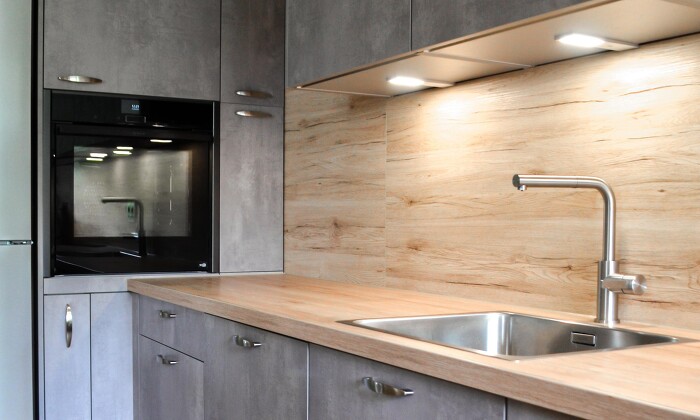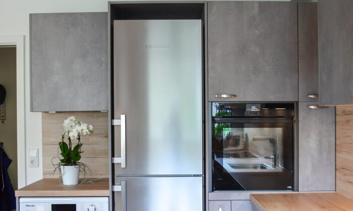 A successful material mix of an oak sand worktop and spatula concrete pearl grey fronts. The colour combination and under-cabinet lighting create peace and harmony.Since our customers always had the washing machine in the kitchen and wanted to keep it that way, we included matching kitchen elements for the washing machine. Therefore, it was perfectly framed and became part of the kitchen.
