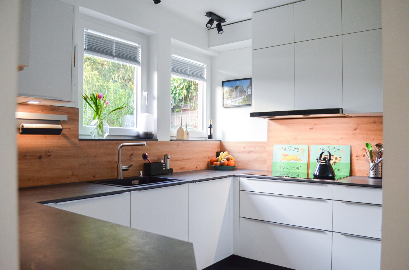 Our goal is that everyone gets their kitchen as they wish. We discuss and consider everything to the smallest details. The crystal white matt lacquer front, the worktop & window sill in a concrete graphite look and the back panel in oak achieve an exciting look that is emphasised even more by the discreet stainless steel-coloured handle strips. An eye-catcher is the railing system, which is beautifully highlighted by the base unit lighting. As the room is quite small, we opted for planning the cabinets up to the ceiling height - this makes the room look higher and creates a tidy impression. A special feature of this kitchen is the berbel GmbH extractor hood. Here, a technically ingenious wall box has been installed outside. This opens automatically when the extractor is switched on and closes just as automatically as soon as the extractor is no longer in use. To enjoy a coffee in between, you can sit comfortably at the small corner counter on the bar stool and read a book.