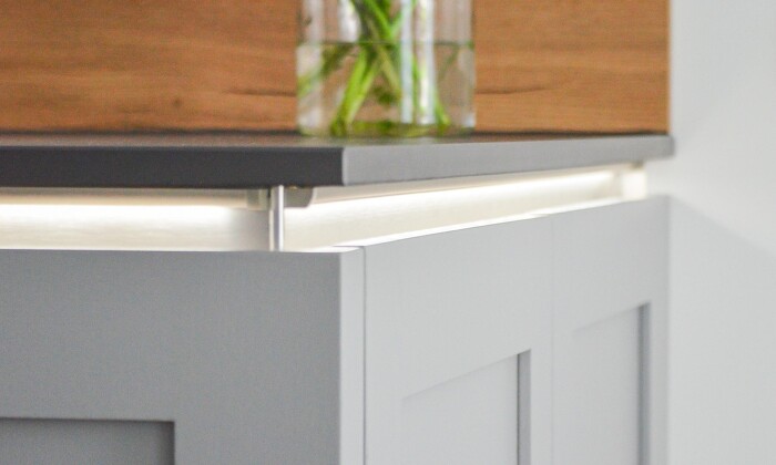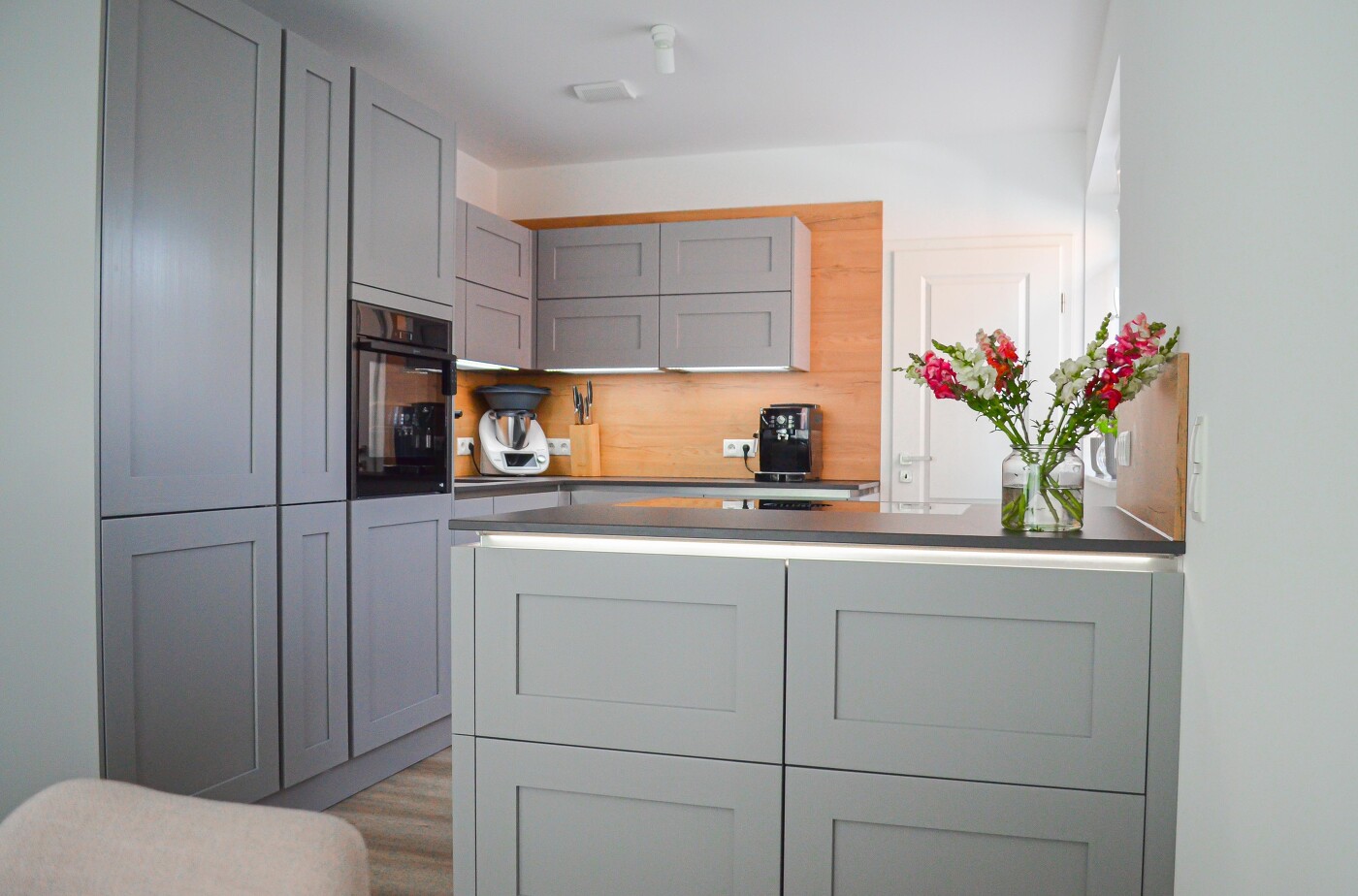 Unsere Kunden haben ein Haus gebaut und wir durften für Ihr neues Zuhause Ihre Traumküche planen. Habt Ihr schonmal eine Landhausküche ohne Griffe gesehen? Toll, oder? Hier sind alle Elemente im Einklang: Durch die perlgraue Holz Kassettenfront, die Alteiche Nischenverkleidung, der Neolith Basalt Black Arbeitsplatte und der Unterschrankbeleuchtung wirkt alles harmonisch und modern. Die Kücheninsel ist ein perfekter Mittelpunkt, um gemeinsam zu kochen.