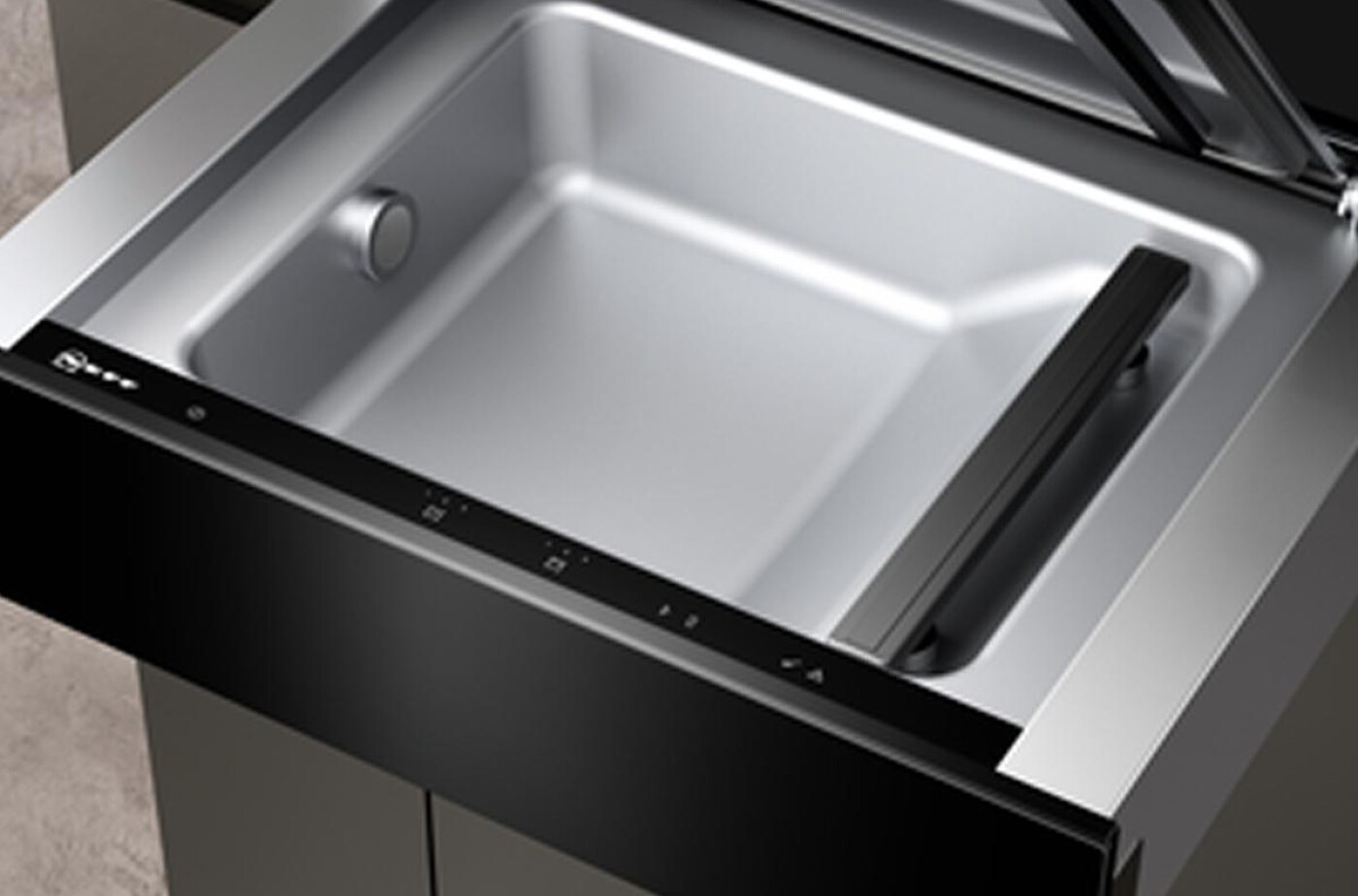 Vakuumiergeräte kennt jeder, aber was soll das als Schublade, und wo ist der Vorteil? Zum einen werden die Schubladen eingebaut, man muss also nicht noch ein weiteres Elektrogerät irgendwo verstauen. Zum anderen entsteht das Vakuum in der gesamten Schublade und das bedeutet, dass man auch Suppen, Soßen oder etwa Mariniertes vakuumieren kann.