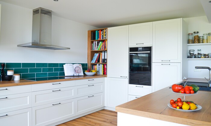 Modern Country - a charming and modern country house kitchen. The white wood fronts and the wooden worktop radiate simplicity and coziness. The splashback made of tiles in aquamarine breaks the typical country house style and creates a lovely atmosphere. The linear design of the Slide & Hide oven from NEFF Home DACH and the integrated warming drawer achieve a minimalist look. This kitchen is definitely the new favorite place of the family and it offers enough place to cook.