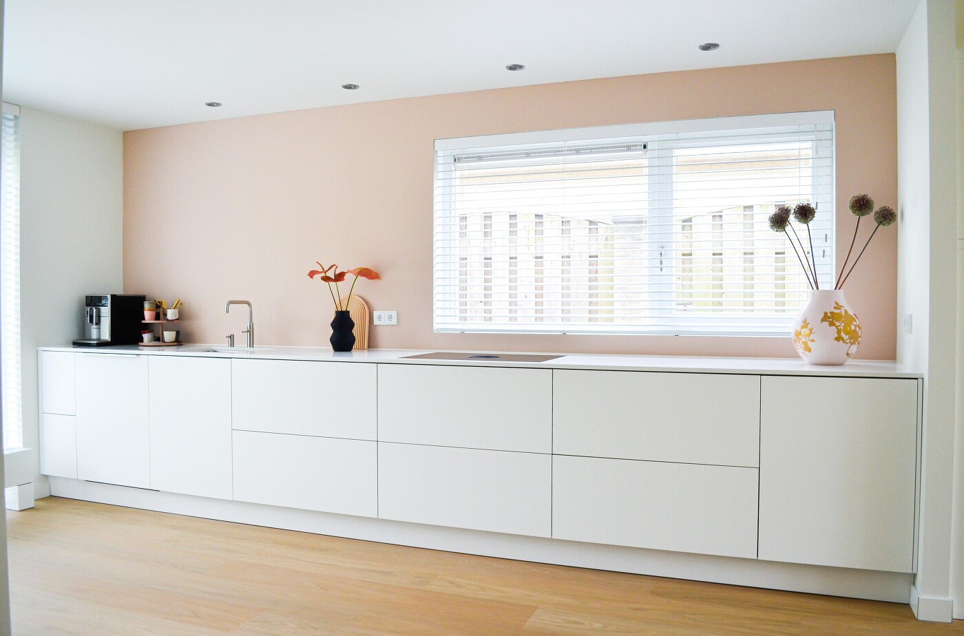 Eine ruhige und offene Küche, die funktionale Detaillösungen bietet. Die grifflose One-Line Küche strahlt durch die weiße Mattlack Front und Quarzstein Arbeitsplatte eine wohnliche Atmosphäre aus. Der Hochschrank wurde in einem speziell angefertigten Trockenbau montiert. In diesem Hochschrank befindet sich ein Kühlschrank, der sich elektrisch öffnen lässt und zwei Backöfen von Bosch Home in Kombination mit einem Dampfgarer und einer Mikrowelle. Der eingebaute Quooker ist ein Allzweck-Helfer und liefert Stilles- oder Sprudelwasser und kochendes Wasser. Ein BORA Kochfeld wurde unter dem Fenster nach draußen angeschlossen – somit wirkt die Küche schlicht und elegant.
