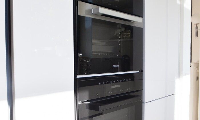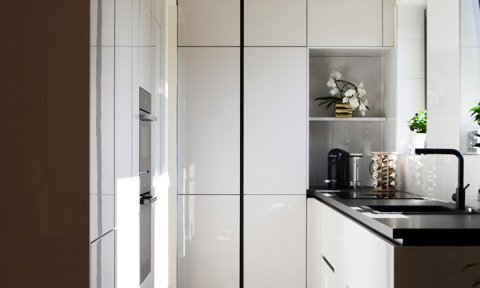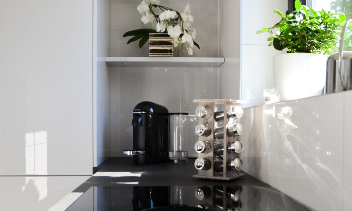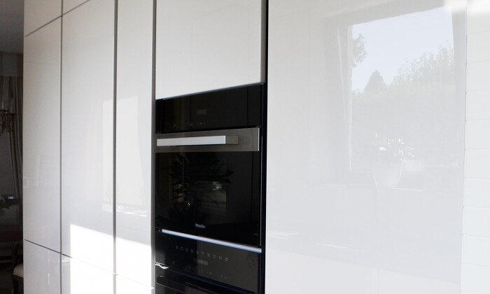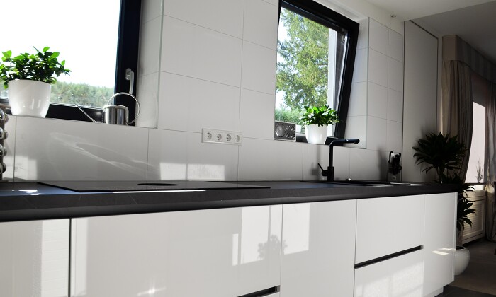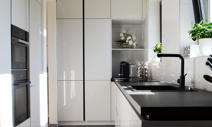 Simple elegance for a modern kitchen. The satin high-gloss surface and the dark marble worktop create a strong yet harmonious contrast. Ceiling height planning creates a classy and simple kitchen design. The tall cabinets contain electrical appliances and enough storage space for food and kitchen utensils. The Bora hob gives the room an open look and makes cooking enthusiasts' hearts beat faster.