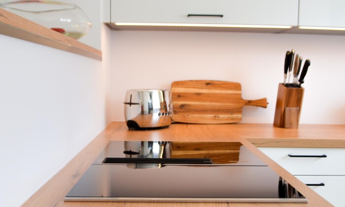 A special feature of this kitchen is the glass back panel with LED lighting behind the Bora hob. This serves not only as a back splash, but also as a lighting element.