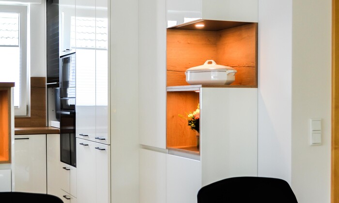 To not make this kitchen look like a separate room, beautiful shelves with lighting have been integrated to make everything a little more open.