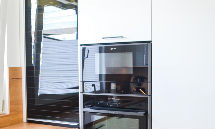 The white high-gloss lacquer front, in combination with a natural old oak worktop and a matt black handle strip, create a simple elegance. The tall unit contains a NEFF built-in oven and a NEFF microwave with grill function. To save space, the pull-out shelf in the black glass cabinet serves as the perfect storage space for the coffee machine.