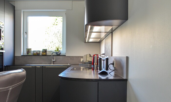 This kitchen has a worktop made of natural stone "nero assoluto" and laser soft fronts in graphite lacquer laminate. The exclusive style is emphasised even more by the discreet stainless steel-coloured handle strips. The back panel has a spatula concrete pearl grey look. Above, there are wall units with folding lift doors and LED floor lighting, which draws attention to the Neff induction hob. The base and wall unit at the right side of the kitchen are a great design accent thanks to the rounded edges. Opposite, an appliance tall cabinet is equipped with a Liebherr refrigerator, a Neff steam oven and a Neff built-in coffee machine.