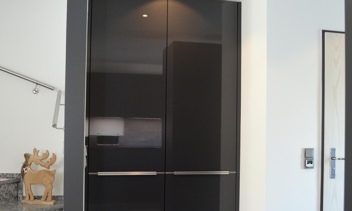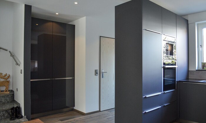 Our customers wanted a wardrobe in the hallway to match the kitchen. For this purpose, we built a tall cupboard out of kitchen furniture with cristall carbon metallic high-gloss lacquered fronts.