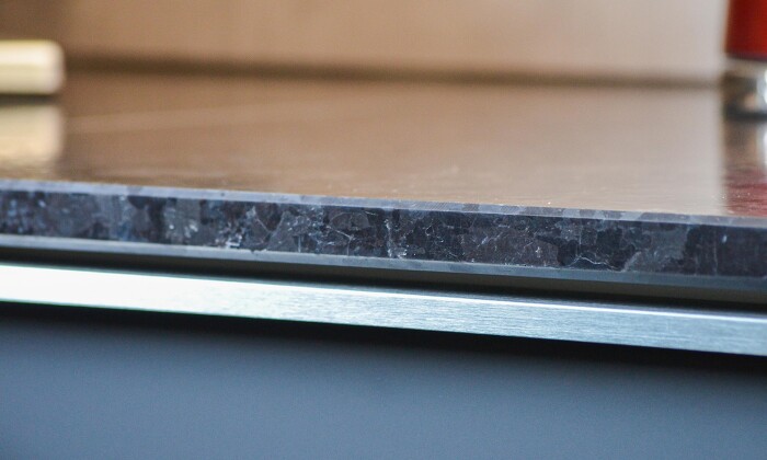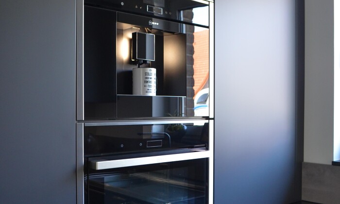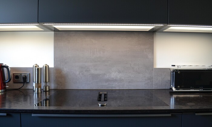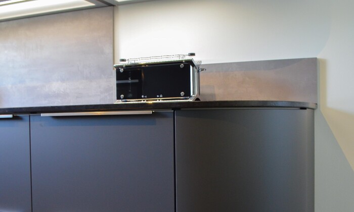 Kühl wirkt cool! In dieser Küche befindet sich eine Arbeitsplatte aus dem Naturstein „Nero Assoluto“ und Laser Soft Fronten in Lacklaminat Graphit. Der exklusive Style wird durch die dezenten edelstahlfarbende Griffleiste noch mehr betont. Die Nischenverkleidung hat eine spachtelbeton perlgrau Optik. Dort drüber befinden sich Oberschränke mit Falt-Lifttüren und LED-Bodenbeleuchtung, die das Neff Induktionskochfeld perfekt in Szene setzten. Der Arcaden Unter- und Oberschrank, sind durch die Abrundungen ein toller Designakzent. Gegenüber ist ein Geräte Hochschrank ausgestattet mit einem Liebherr Kühlschrank, einem Neff Dampfbackofen und einem Neff Einbau-Kaffeevollautomaten.