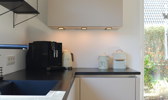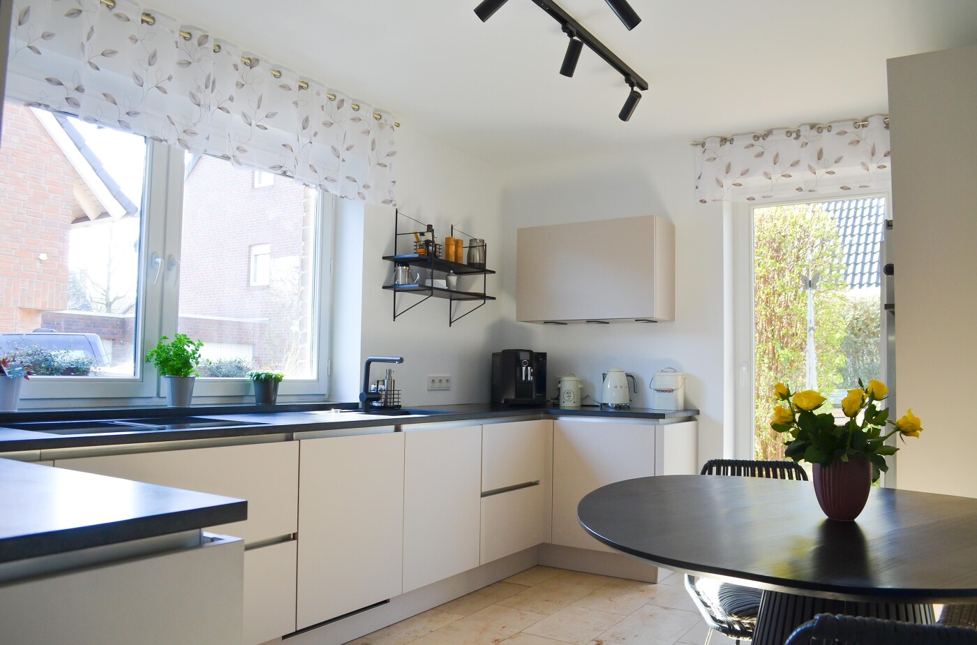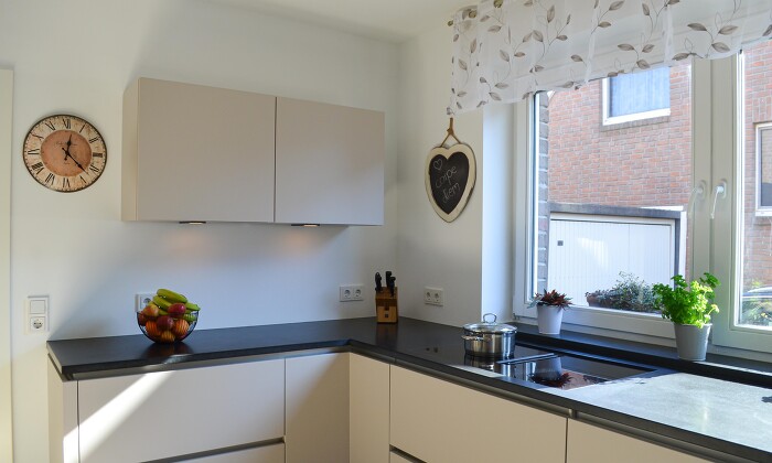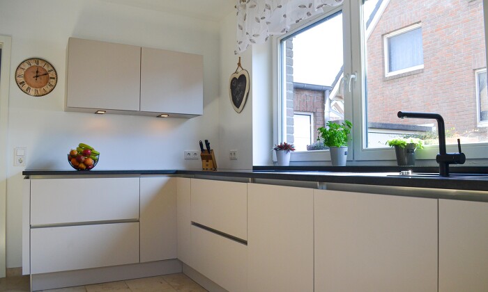 Unsere Kunden haben uns herzlich empfangen, als wir zu Besuch waren, um bei Ihnen Bilder von Ihrer schönen und wohnlichen grifflosen U-Küche zu machen. Hier trifft eine Nero Assoluto Arbeitsplatte auf eine Kaschmir lacklaminat Front mit einer edelstahlfarbende Kehlleiste.