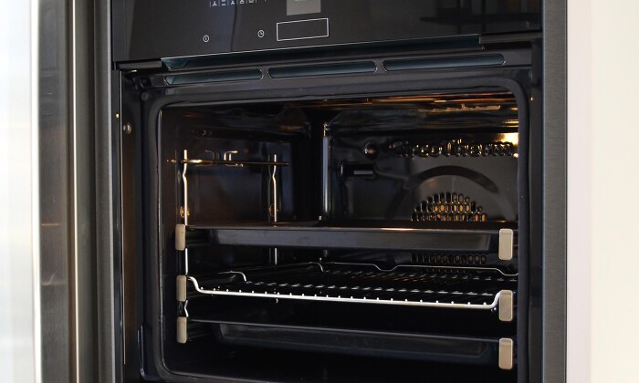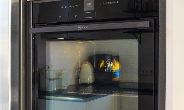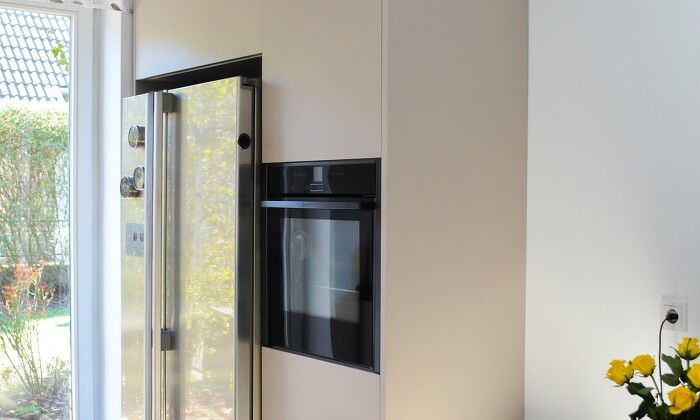 Auf der gegenüberliegenden Seite von der Küche befindet sich ein Geräte Hochschrank, der den Kunden eigenen Kühlschrank einrahmt. Auch in dieser Küche findet man den tollen Einbaubackofen von Neff wieder, den Slide & Hide in Graphit Grey. Das Neff Induktionsfeld, als auch die schwarze Spüle von Blanco wurden flächenbündig eingebaut