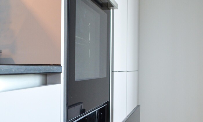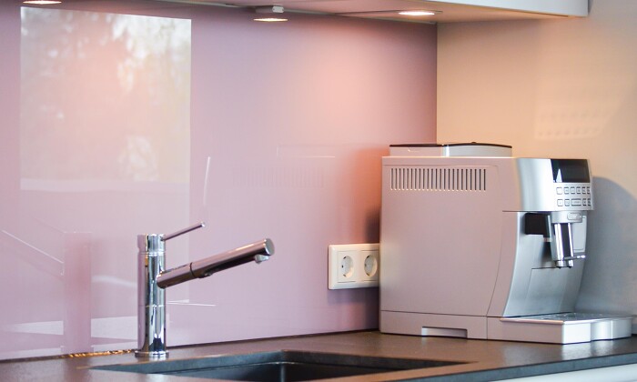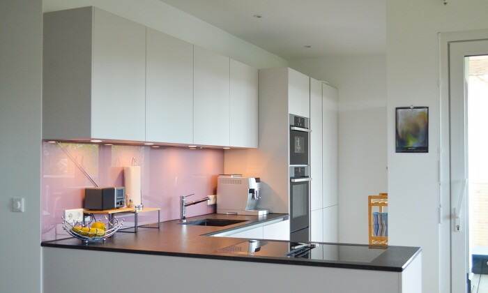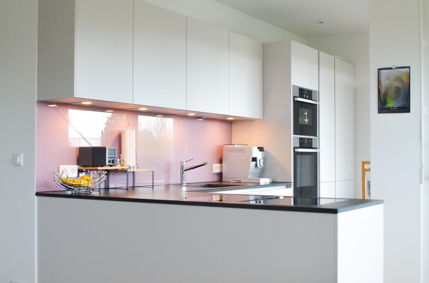 A small but very beautiful handleless L-kitchen. At first glance, it looks like the kitchen is made of a white front. However, if you look closely, you will see that it is a matt satin front. Matching this is the rose-colored glass back panel, which is illuminated by the LED under-cabinet lighting. The NEFF hob is integrated into the "Nero Assoluto" natural stone worktop. The appliance cabinet contains a NEFF oven and a NEFF warming drawer to keep food or drinks warm.