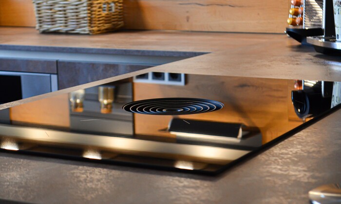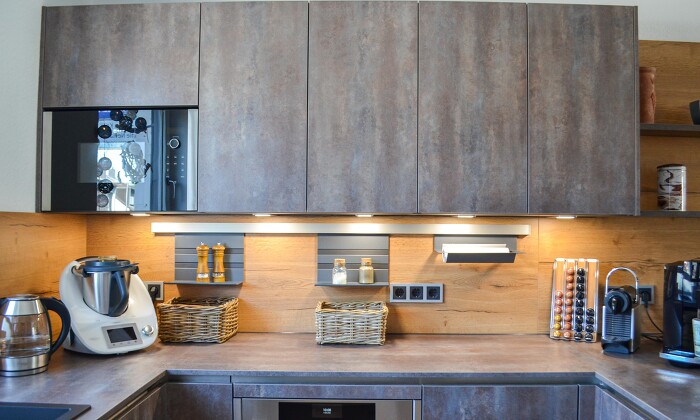 Die Oxid Keramikstruktur Front und Arbeitsplatte und die Alteiche Natur Nischenrückwand verleihen dieser Küche ihren natürlichen Charme. Die Unterschrankbeleuchtungen setzen nicht nur warme Akzente, sondern setzten auch das Relingsystem in Szene. Für eine freie Sicht beim Kochen sorgt das Bora Pure Induktionskochfeld und die Regale schaffen Platz für Deko.