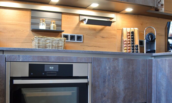 The oxide ceramic structure of the front and worktop and the natural wood back panel create a charming atmosphere within this kitchen. The under-cabinet lighting not only sets warm accents but also highlights the banister system. The Bora Pure induction hob ensures a clear view while cooking and the shelves create space for decoration.