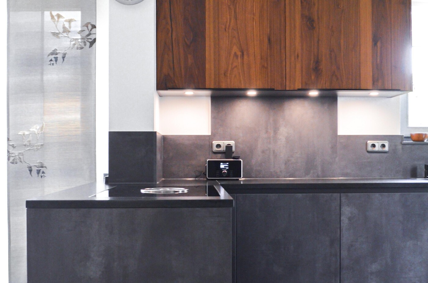 Zurückhaltend, aber edel ist die Wirkung der Spachtelbeton Graphit Front und Nischenrückwand in Kombination mit den Echtholz Nussbaum Hängeschränken und der Nero Assoluto Natursteinarbeitsplatte. Ausgestattet mit monderster Küchentechnik von Bora und Neff, stehen gemütlichen Kochabenden nichts im Wege. Ein schmaler Unterschrank wurde eingeplant, um den NEFF Einbaubackofen im Gerätehochschrank mit Leichtigkeit öffnen zu können.