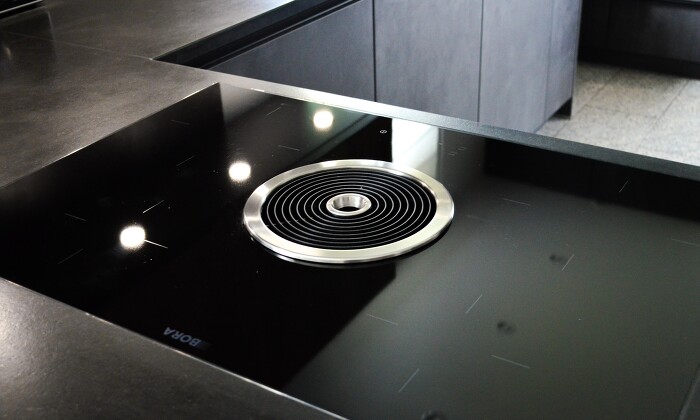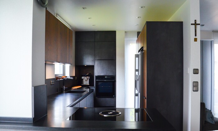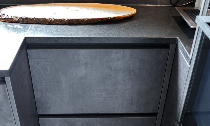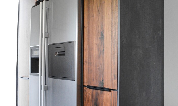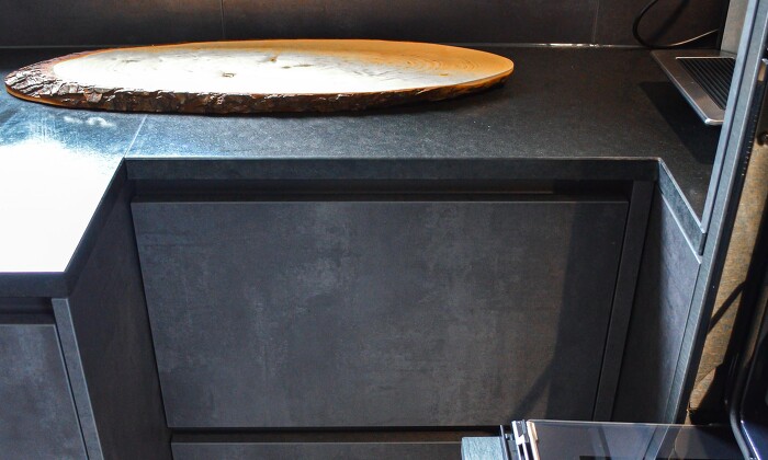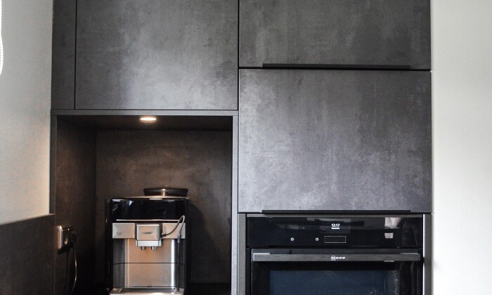 The effect of the spackled concrete graphite front and niche back panel in combination with the real wood walnut wall units and the Nero Assoluto natural stone worktop is reserved but elegant. Nothing is holding back from cozy cooking evenings, due to the kitchen being equipped with the latest kitchen technology from Bora and Neff. A narrow base cabinet has been included to allow the NEFF built-in oven in the appliance tall cabinet to be opened effortlessly.