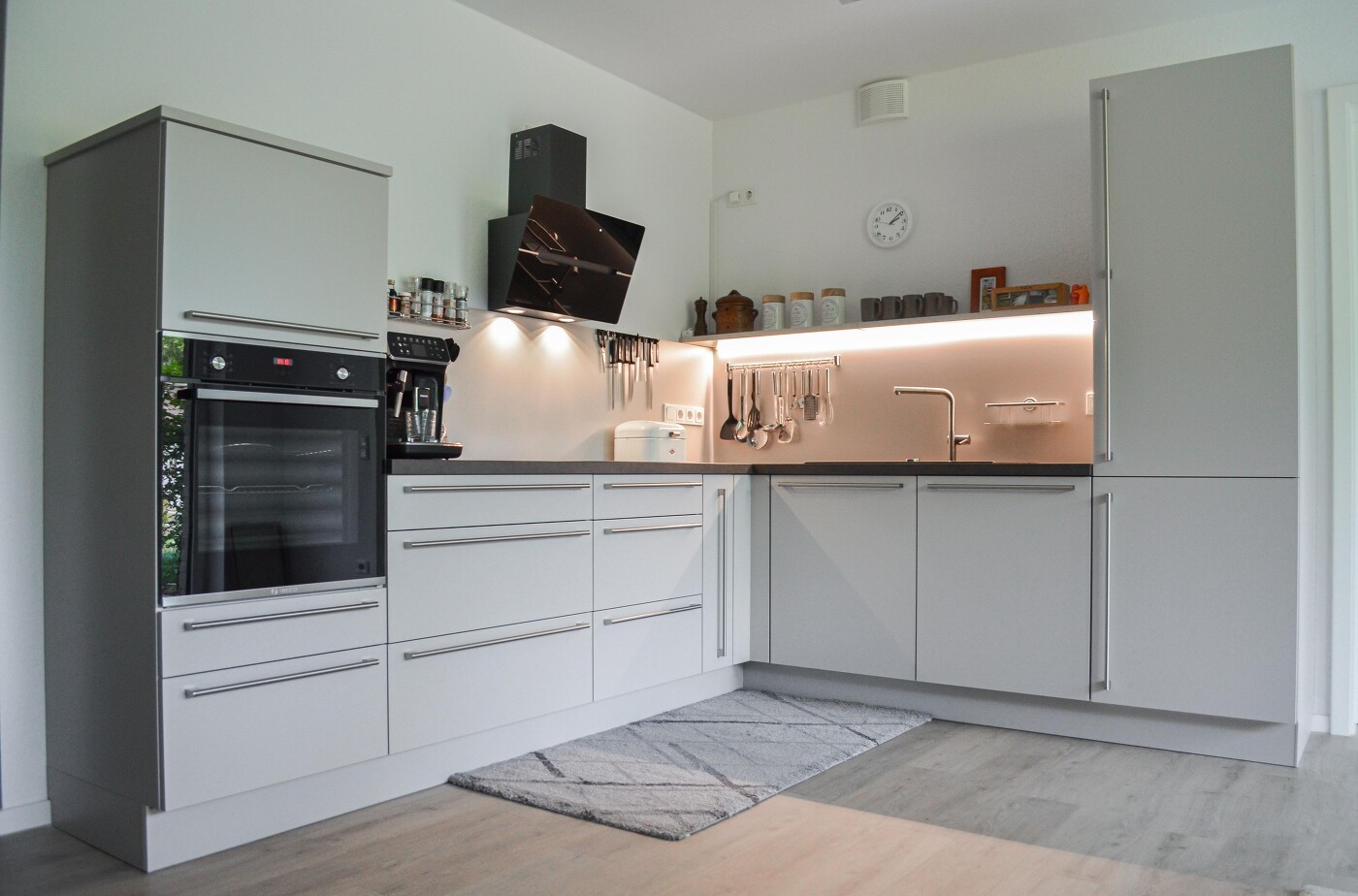 This L-kitchen creates a sense of security with its sand-coloured kitchen front and matching niche wall paneling. The Copper Vintage worktop and the handle railing bars serve as a soft contrast. As always, lighting elements could not have been left out here either.