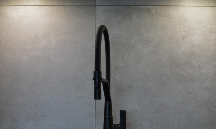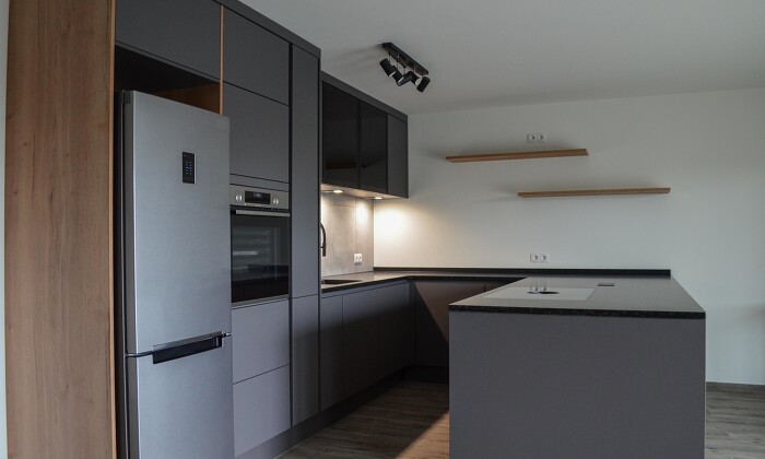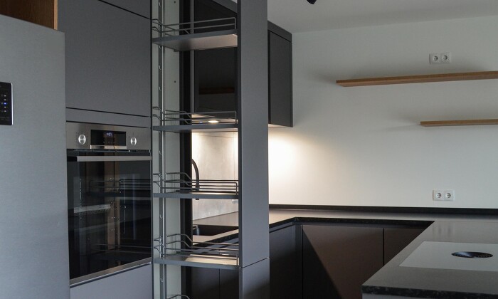 An open kitchen connects body and soul and provides a living space for socializing. This beautiful handleless kitchen with a slate grey super matt front and a granite black flamed worktop provides a modern yet casual charm. The shelving units in Sierra Oak wood reproduction glass beautifully complement the wall units with aluminum framed doors in black and black glass.