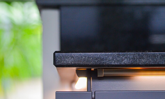 Graphit Mattlacke Fronten bilden in Kombination mit einer Arbeitsplatte, einem Spritzschutz und einer Fensterbank aus poliertem Naturstein (Nero Assoluto) ein spannendes Miteinander. Hinzu kommt, dass die Mattlack Polarweißen Hochschränke mit eingebauten Kaffeevollautomat und Backofen eine stilvolle Küchenharmonie bilden. Die Reling dient als Funktionselement und die grifflose Küche wird durch die LED-Beleuchtung extra in Szene gesetzt.