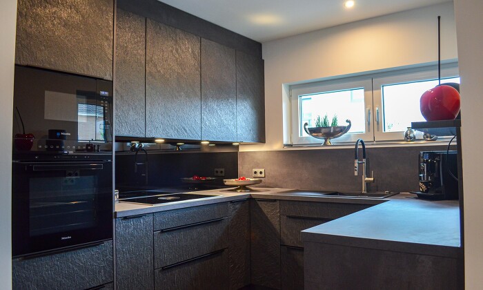 Jede Front ist ein Unikat. In dieser Küche ist es die spezielle Front "Black Star Steinfurnier" - ein wahrlich ungewöhnliches Design. Charakteristisch für diese Front ist die fein gespaltene Oberfläche und das hochwertige Material. Passend zu den Fronten sind die schwarzen Aufsatzgriffe und die Miele Geräte in kompletter schwarzer Optik. Die Spachtelbeton Arbeitsplatte und Rückwand inklusive die schwarze Glasrückwand ergeben zusammen mit den Fronten ein großartiges Gesamtbild. Das Bora Kochfeld wirkt in dieser Küche dezent und unauffällig. Als Eckschrank wurde ein Rondell Schrank integriert, dieser bietet viel Stauraum für Geschirr und Vorräte.