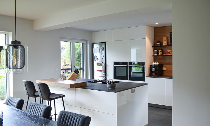 Die grifflose Häcker systemat Küche mit Tipmatic Softclose erziehlt ein zeitloses und puristisches Design. Die weißen lack Hochglanzfronten, die Küchengeräte und die Nischenrückwand aus Holz fügen sich zu einem gelungenen Gesamtwerk zusammen. In dieser Küche wird der weiße Grundton optisch mit einer Keramik Arbeitsplatte (Pierre Bleue) ergänzt und der freistehende Liebherr Kühlschrank wird von den Hochränken perfekt eingerahmt. Die angesetzte Theke lädt zum Verweilen ein und das Bora Gas-Kochfeld (Classic 2.0) zum Kochen. Hier wird das Küchenfeeling stark zelebriert, da zwei Backofen von Neff genug Platz für festliche Mahlzeiten bieten.