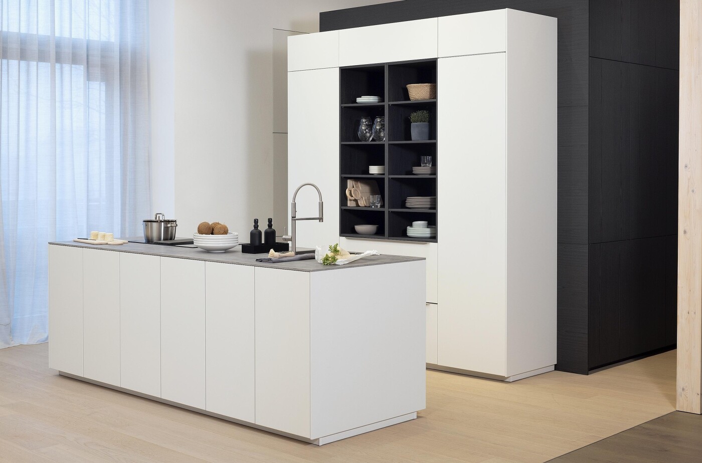 - Küchenhochschränke mit offenen Regalbereichen, was den Wohnmöbelcharakter verstärkt.