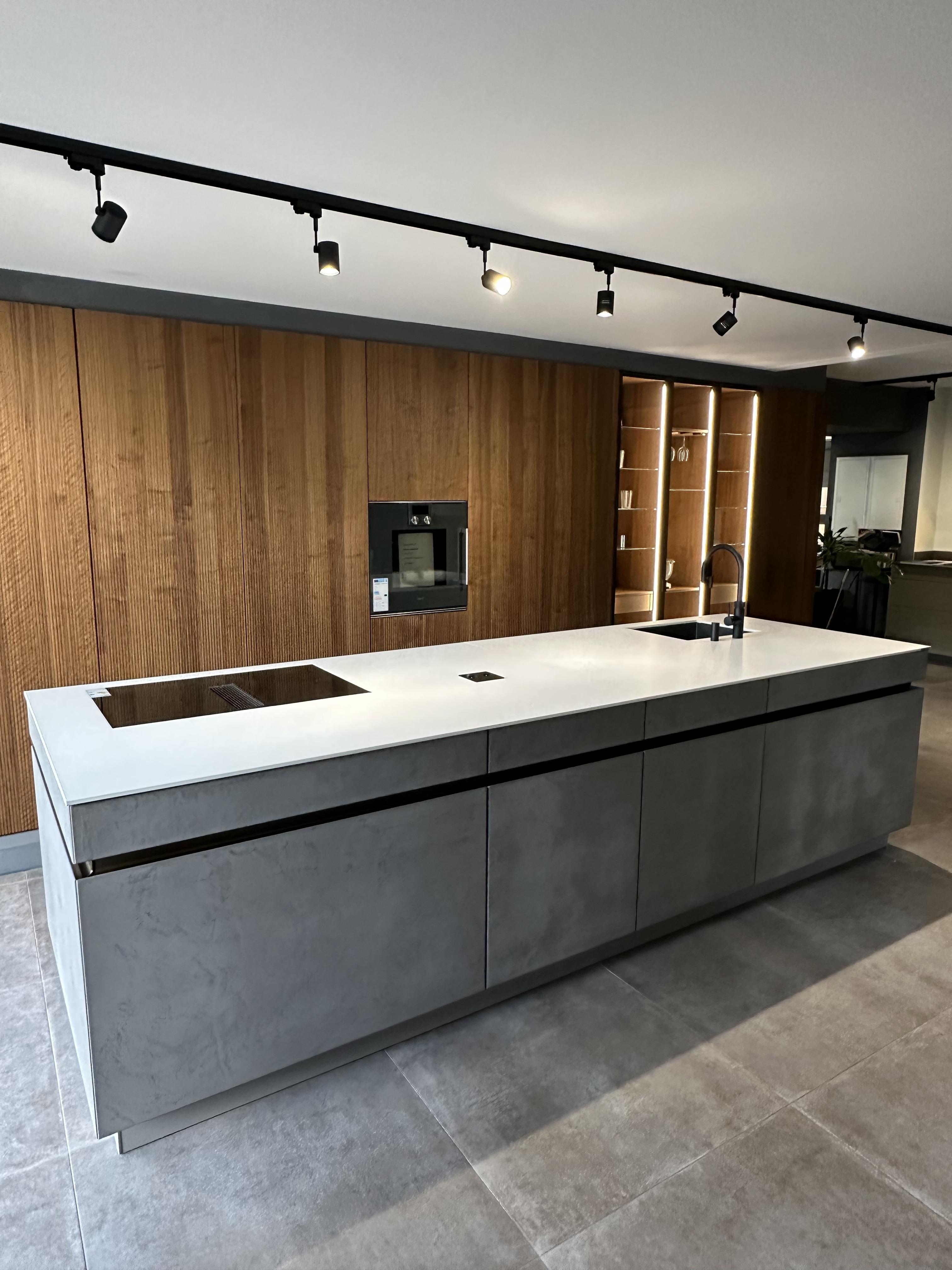 Diese hochwertige Leicht Küche kombiniert edle Materialien in außergewöhnlicher Formensprache: Die elegante Echtholz-Rillenfront Bossa trifft auf eine markante Insel mit Echtbetonfronten. Abgerundet wird das Design durch eine edle Keramikarbeitsplatte und modernste Elektrogeräte, die höchste Ansprüche an Komfort und Qualität erfüllen.